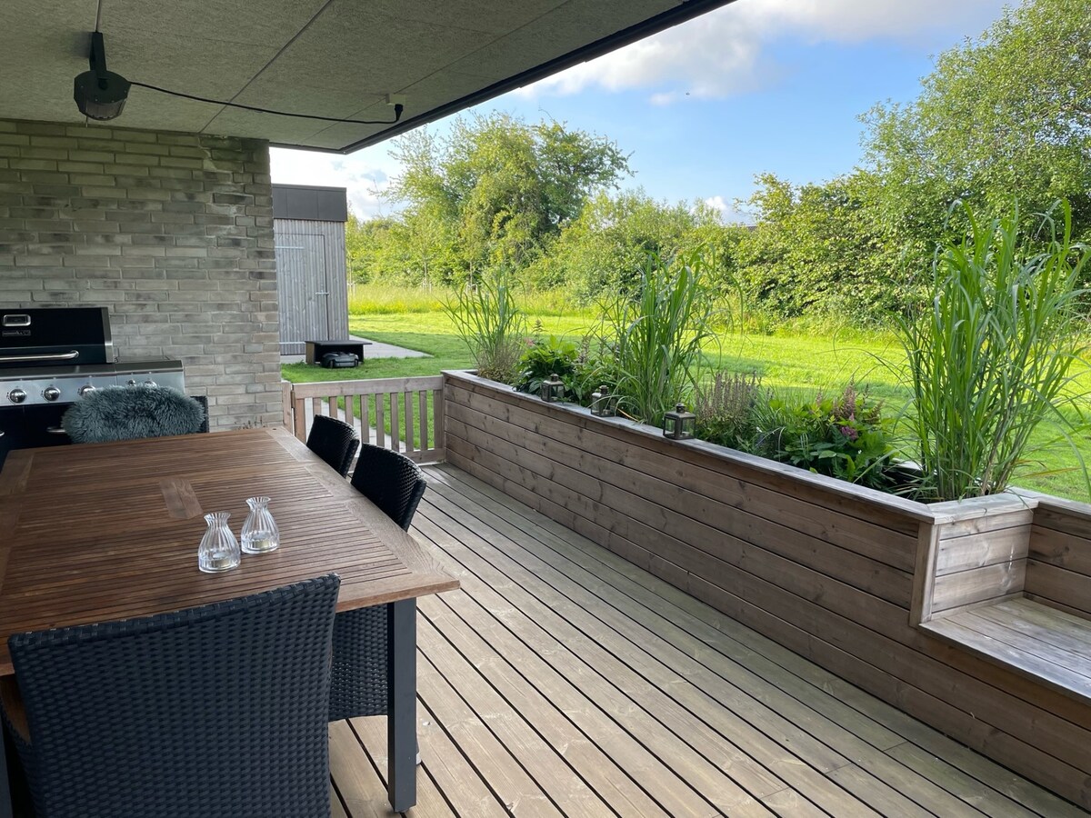 Prelijepa novouređena šarmantna velika kuća sa svijetlom kuhinjom, velikim lijepim kupatilom sa 2 tuša. Veliki, udoban i namješten dnevni boravak sa bio kaminom, velikim sofama i trpezarijom. Dve velike spavaće sobe sa lepim bračnim krevetima. Mirno zeleno okruženje. Savršeno za kućnu kancelariju m. fastspeed Wi-Fi. Privatni ulaz u kuću. Stil je rustikalan i udoban. Mjesto ispunjeno udobnošću i luksuzom. U blizini Legolanda, Billunda, zoološkog vrta Givskud, Kragelund Mose, Koldinghusa itd. Imao je stalnog podstanara od 23. 2020. godine, ali je sada ponovo na Airbnb-u.