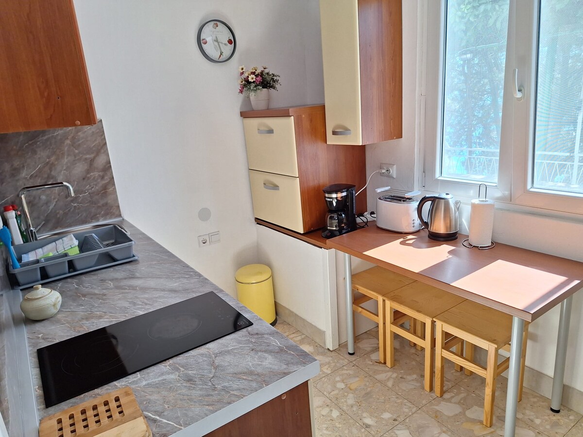 Veliki apartman sa privatnom terasom sa roštiljem i zadivljujućim pogledom na more. Nema puta između kuće i mora. Prostrani stan sa potpuno opremljenom kuhinjom sa rernom, mašinom za sudove, električnim kuhalom za vodu, tosterom, 2 dvokrevetne sobe sa klima-uređajem u svim prostorijama, dnevnim boravkom sa kaučem na razvlačenje za 1 osobu, LCD TV sat, klima-uređajem, internetom, novim kupatilom sa tuš kabinom i mašinom za veš. Sve novo, velika terasa sa ležaljkama besplatno, šljunčana plaža 30 metara od kuće. Besplatan parking 300 metara od kuće