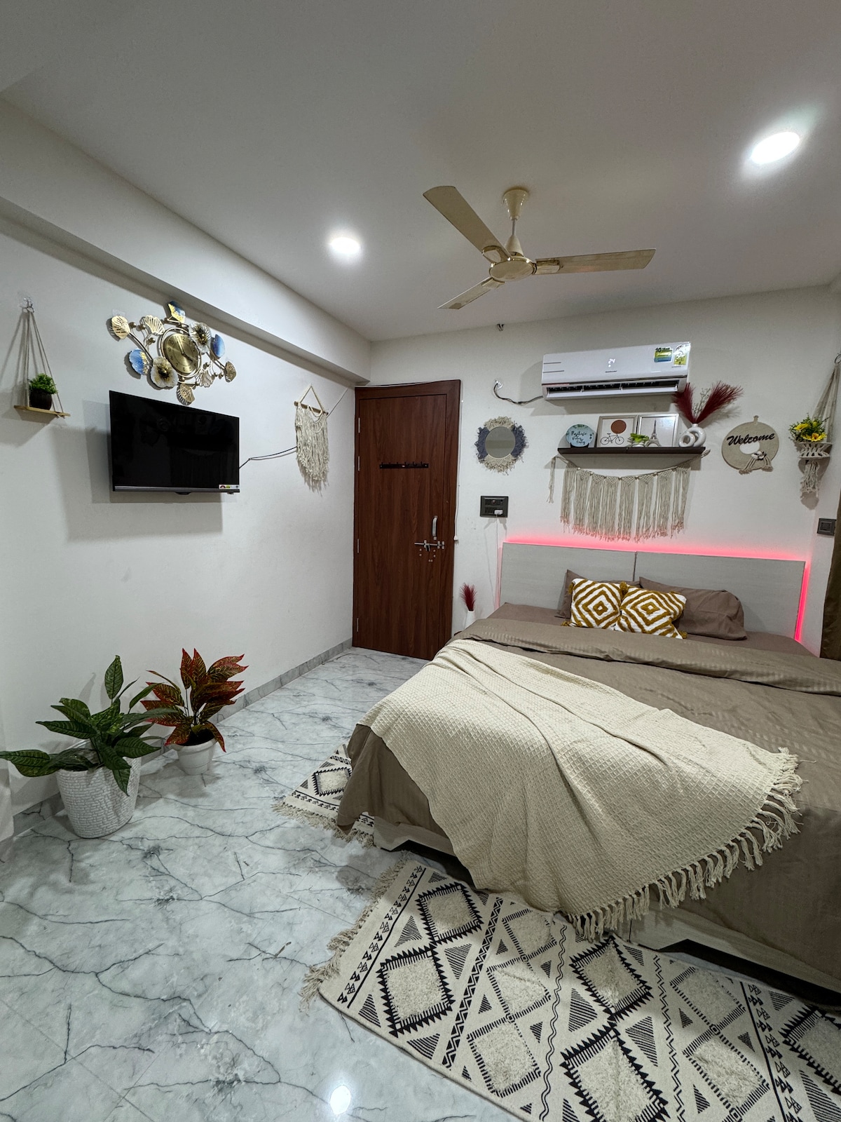 The One by Sona Living je luksuzni 2BHK smeštaj nove generacije sa glasovnom kontrolom, sa Alexa automatizacijom, pametnim TV-om, pametnim bravama i vrhunskim Flo dušekima za izuzetnu udobnost. Uživajte u elegantnom enterijeru, dobro provjetrenim prostranim sobama i privatnom balkonu za opuštanje. Pažljivo odabrani sadržaji pružaju iskustvo nalik hotelu uz toplinu doma, a uz sve što vam je potrebno u blizini, savršeno je za porodice, parove ili poslovne putnike koji traže jednostavan moderan život.