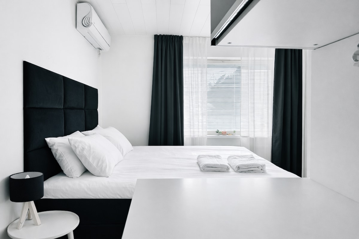 Moderan, potpuno opremljen studio na ostrvu Kotka, iznad krovova, u najljepšoj i najvišoj kući u gradu, na ivici parka. Pogled na more s balkona. Predivna kuhinja. Uživajte u boravku! Od vrata do parka, nekoliko minuta hoda do mora, kafića i marine pored. Besplatan parking. Stan je u potpunosti renoviran i čeka nove goste. Moguć je ulazak bez ključa. Visokokvalitetni bračni krevet od 160 cm i futon od 120 cm za dodatni dušek.