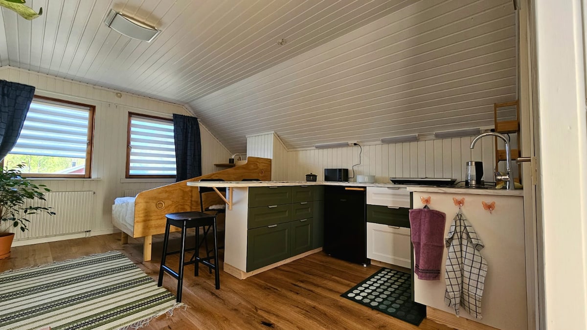 Stay in our beautiful stuga (2022) with a traditional look and modern interior. Enjoy the unique sound of cranes, and spot a deer or moose in the backyard during Summer. Take a walk along the stream, and discover the different colours of trees in the Autumn. Explore the white world and the frozen lake in the Winter. And experience the awakening of nature during Spring. The stuga is suitable for max. 2 persons.