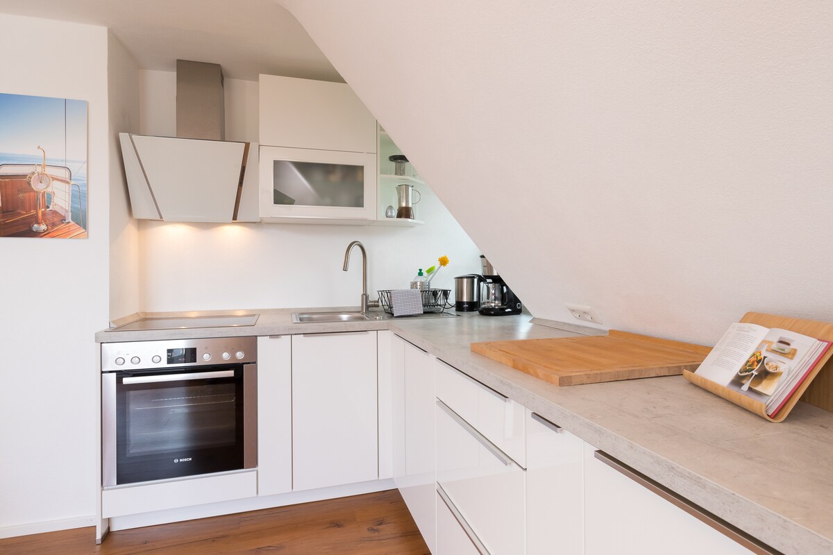 Iznajmljujemo naš šarmantni stan u potkrovlju, 52 m². Sastoji se od kuhinje/ dnevnog boravka/ spavaće sobe/ kupatila i WC šolje za goste. Kuhinja je potpuno opremljena, uključujući Mašina za sudove. Prostrano kupatilo sa ugaonom kadom i odvojenim tušem poziva vas da sanjate. Uživajte u jutarnjoj kafi na balkonu s pogledom na jezero i planine.