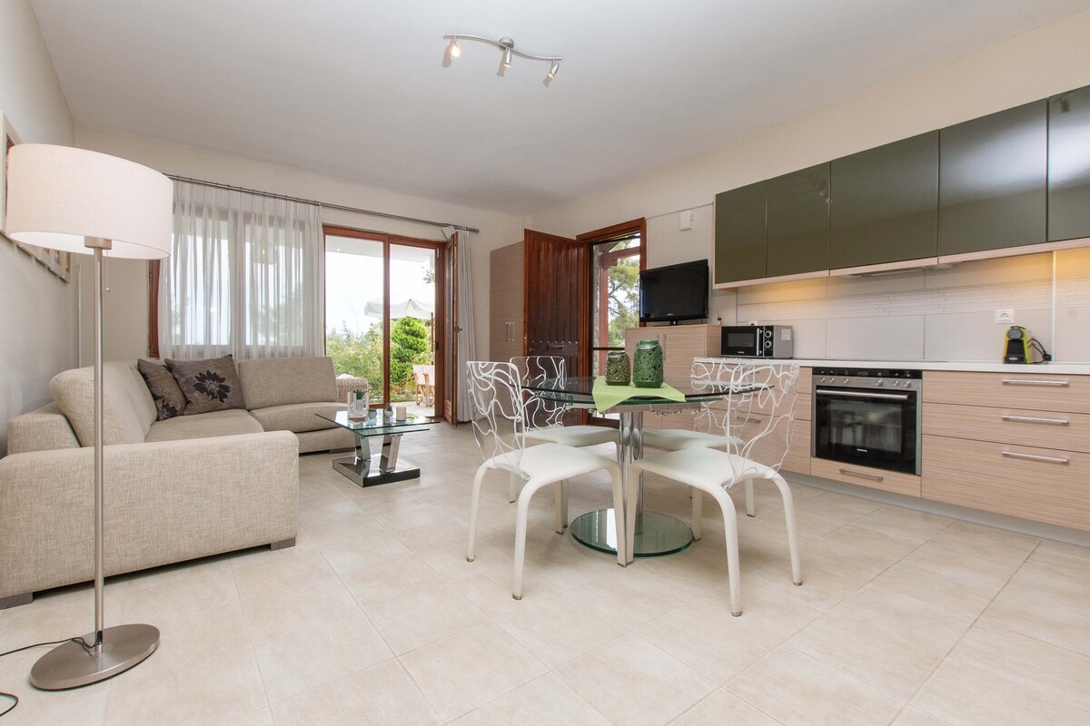 Vila u Sanijevu šumu borove šume. 20' pješice od plaže Koutsoupia, plaže Sani, odmarališta Sani i marine. Bašta i balkon pored jedinstvenog pejzaža kako biste proveli kvalitetno vreme sa svojim najmilijima. Privatna parking mesta: 2 Jedinstvena pozicija naše vile osigurava da dobijete i opuštanje koje tražite, ali i da imate sve sadržaje koje pruža Sani Beach.