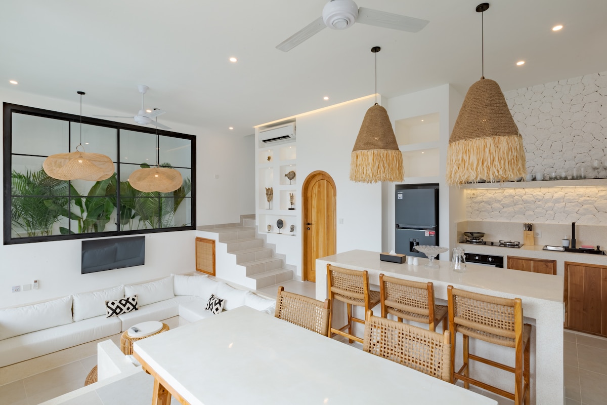 Playa 12 Canggu Villa je potpuno nova, moderna dizajnerska vila koja se nalazi u srcu Čanggua. Ova prelijepa i udobna vila savršeno se nalazi samo nekoliko minuta od svjetski poznate plaže Čanggu i kluba Finn's Beach, samo 1 minut hoda od restorana Avocado Factory i savršena je za vrhunski odmor na Baliju za porodicu! - Otvorena ili zatvorena dnevna soba - Snažan Wi-Fi - Potpuno opremljena kuhinja - Vlastita privatna bašta i bazen - 2 spavaće sobe na spratu, svaka sa spojenim kupatilima
