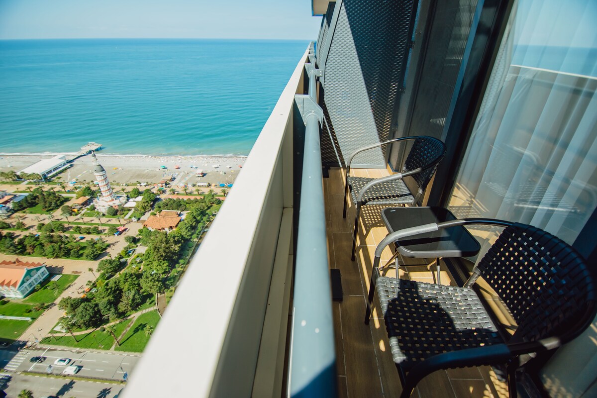 Stan ima sve vrste sadržaja, a plaža je udaljena samo 4 minuta. Stan je udaljen 250 metara od delfinarijuma i 400 metara od Kuće pravde. Udaljenost do međunarodnog aerodroma Batumi je 3 km. U blizini se nalaze Goodwill, McDonald 's, Waterpark, Dolphinarium, Dancing Fountains. Stan se nalazi na 9. spratu sa predivnim pogledom. Novouređeno 2018.