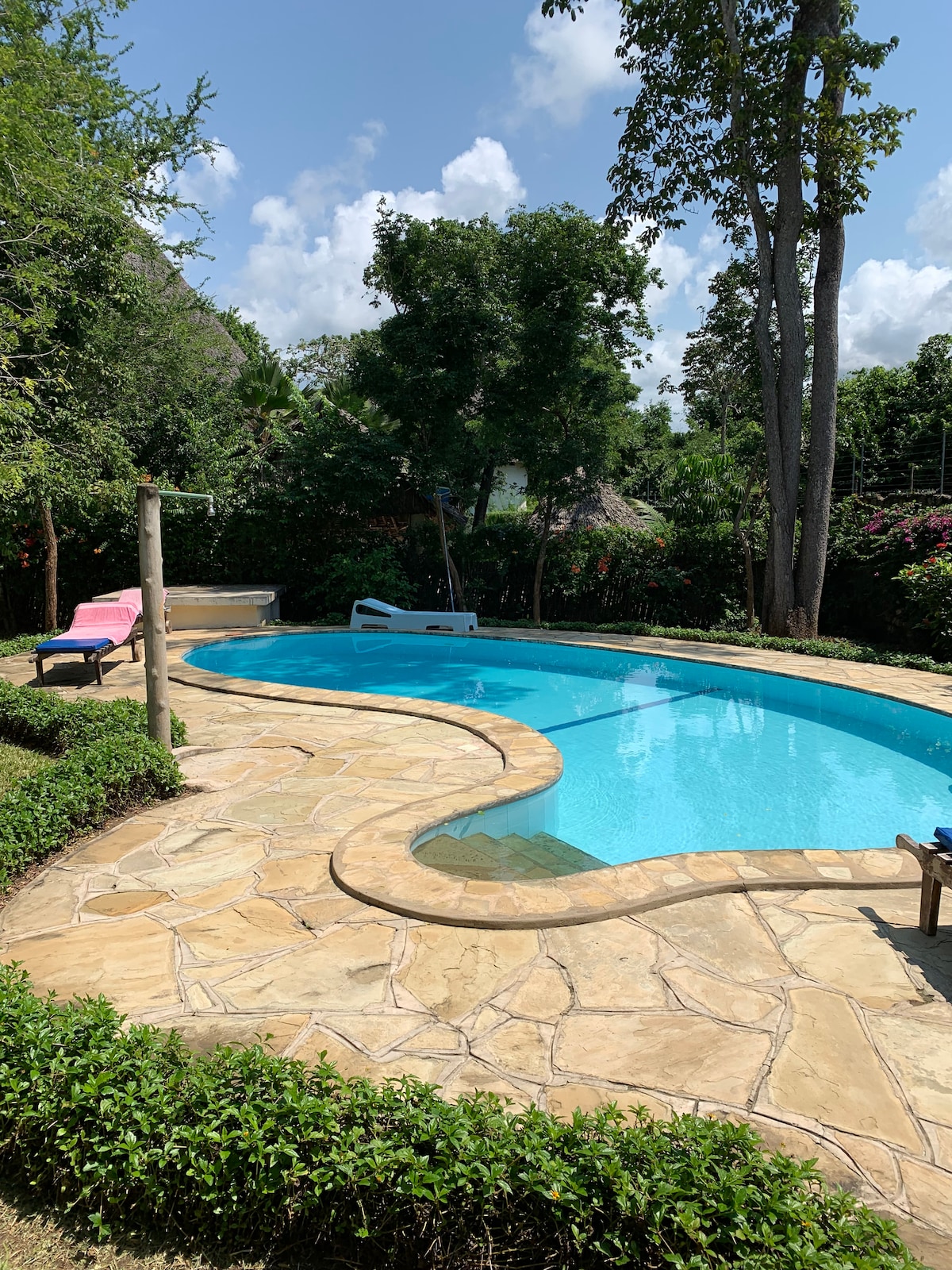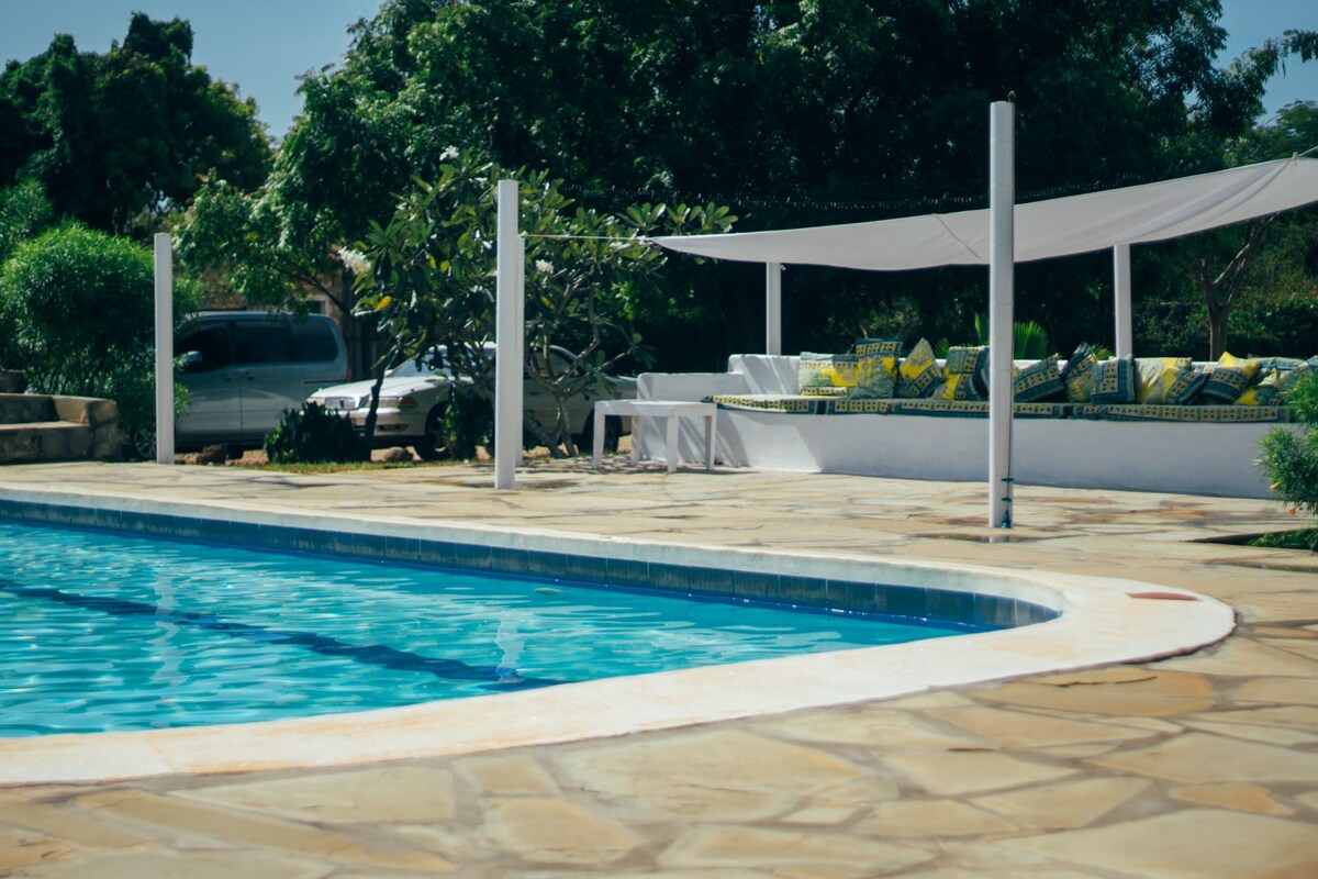 COVID Compliant for Kenya. Strictly no visitors allowed during your stay. Christmas/New year 15th December - 15thJanuary, we prefer a minimum 7 night stay policy but will accept less. 1 of 2 self catering cottages Pool, gardens, BBQ area. Shared with Tiwani Sunrise. Free WiFi . A 10 minute stroll to Tiwi beach and famous Africa pool (a natural formation in the coral, accessible at low tide). En-suite bedrooms, fully equipped kitchen, open plan dining and sitting, cool and breezy.