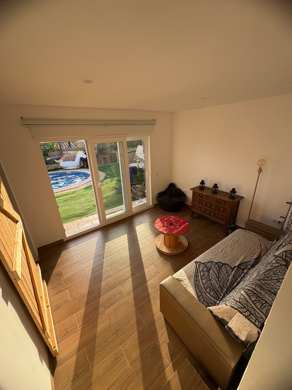Ovaj dom modernog stila idealan je za porodice sa djecom i za osobe smanjene pokretljivosti, jer nema stepenica. Parking je besplatan ispred ulaza, mada ima mjesta za parkiranje 2 automobila na velikom trijemu. Bašta sa bazenom i prostorom za opuštanje. Mirno područje 3 minuta od plaže i supermarketa. Ako želite da se zabavite, javiću vam gdje da idete. Postoji zglobni krevet od 135 cm. oprema za bebe.