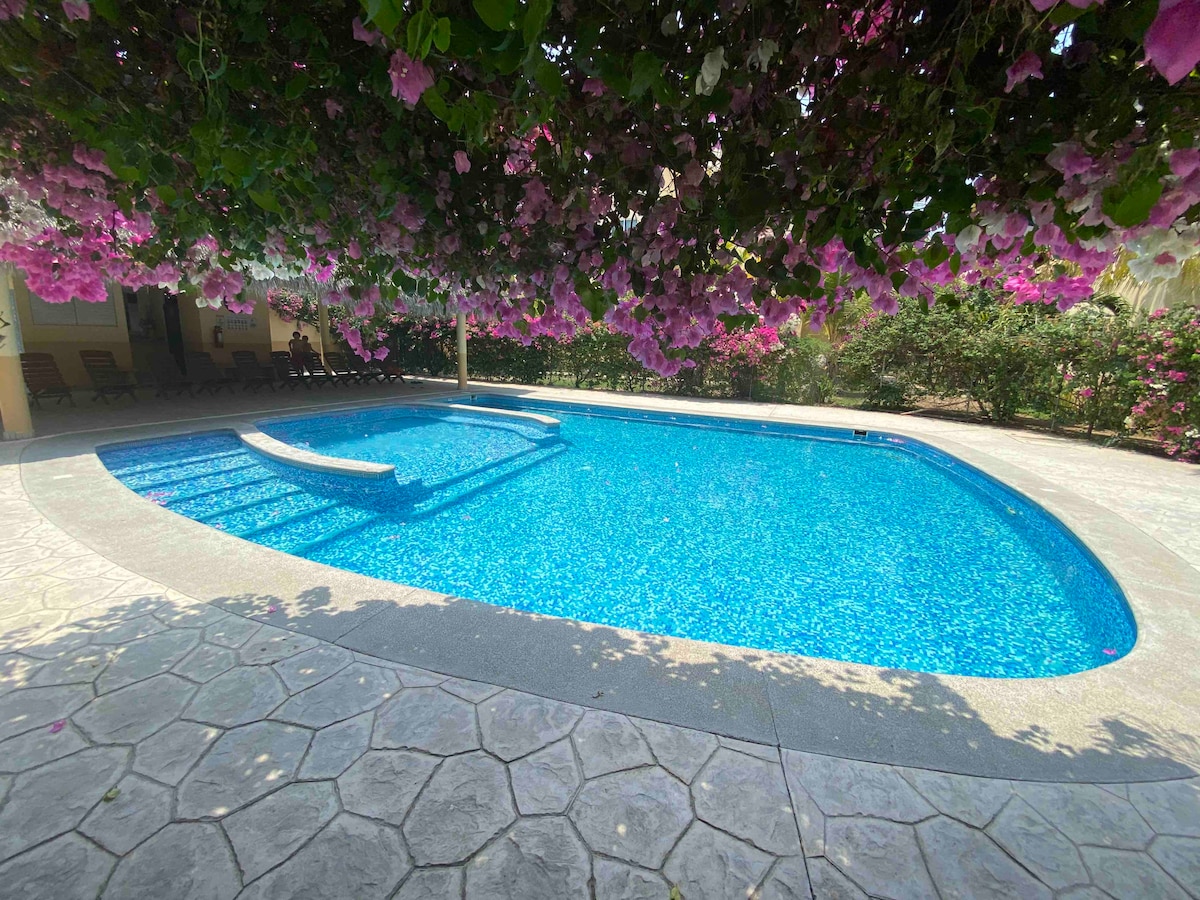 Dođite i opustite se u ovom velikom i dobro uređenom kondominiju sa 3 spavaće sobe. Izležavajte se u prostranim spoljnim prostorima, večerajte u našoj potpuno opremljenoj kuhinji. Veliki i udobni kreveti s posteljinom za 8 osoba od vaših najbližih prijatelja i porodice. Prošetajte ili se spustite sa vlasnikom koji vam je obezbijedio vozilo za golf do veličanstvenog beskonačnog bazena na poluostrvu ovdje u objektu Cosmo. Samo pet minuta hoda do plaže Arrocito.