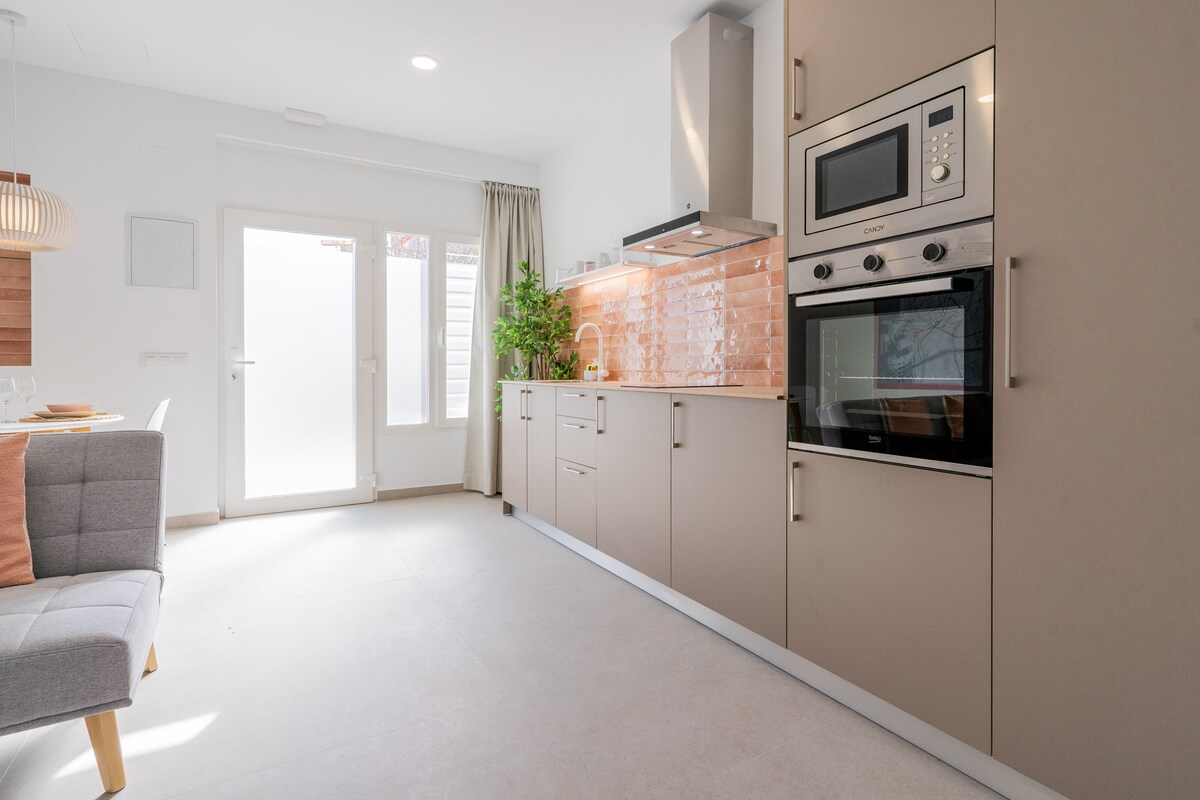 Ovo je naš dom za penzionere, voleli bismo da se preselimo ovde u budućnosti, ali u međuvremenu, nadamo se da ćete imati divan boravak, u Valensiji, u trendi Kabanalu. Kuća je iz 1942. godine, kompletno smo je renovirali i podelili na dve kuće R i M. Kuća R se nalazi u donjem spratu. Kada uđete u smeštaj, videćete dnevnu trpezariju i kuhinju, a oni gledaju na unutrašnje dvorište i čine ga odličnim mestom za uživanje. Na unutrašnjem dvorištu je grejalica, tako da možete da uživate u njoj tokom cele godine, ali imamo vrlo malo hladnih dana u Valensiji. Postoji gornji sprat kojem pristupate iz dnevne sobe, koji ima tri kreveta za jednu osobu (190x90). U dnevnom boravku postoji mali hodnik koji vodi do dve spavaće sobe. Prvi ima spojeno kupatilo, sa tušem, a krevet je dimenzija 160x200 cm. Druga spavaća soba ima bračni krevet dimenzija 160x 190 cm. Pored nje je kupatilo, koje ima kadu. Kada uđete u zgradu, tu je hodnik, gde možete da pronađete ormar, gde možete da ostavite torbe u slučaju da vam je potrebna ranija prijava ili kasna odjava. Takođe, možete da pronađete i mašinu za sušenje veša i mašinu za pranje veša. Ako vam zatreba neka posebna usluga, slobodno nam se obratite i potrudićemo se. Kuća se nalazi u okolini El Kabanala, priobalnog sela sa restoranima, barovima i pijacama. Nalazi se u blizini plaže i luke, a samo 400 metara od stanice metroa koja ima vozove koji vode direktno do centra grada i aerodroma.
