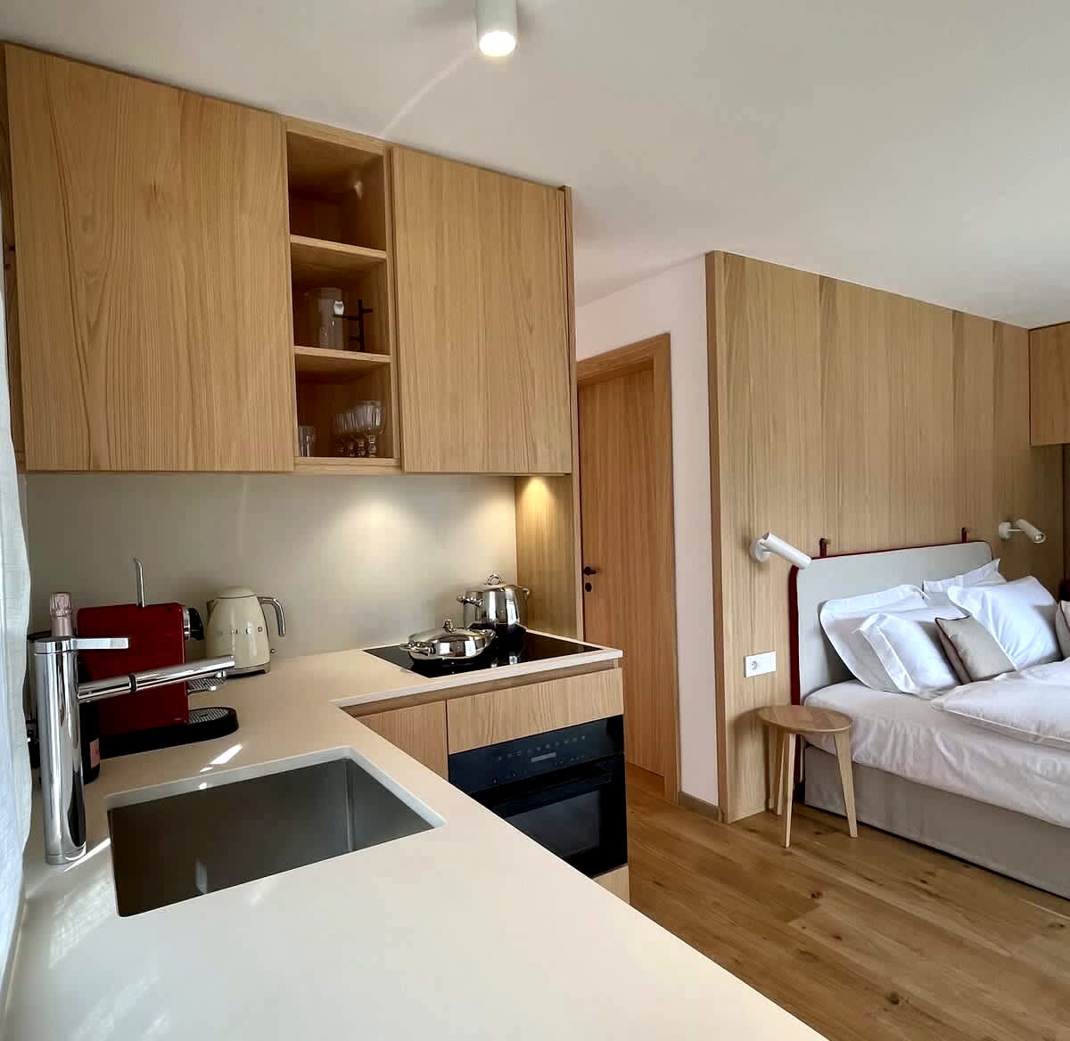 Naši stanovi su prostrani, u drvenom nameštaju i sa svim udobnostima, tako da možete da provedete svoj odmor udobno i opušteno. U svakom stanu nalazi se mašina za pranje sudova, TV u dnevnoj sobi i spavaćoj sobi, pristup internetu, kupatilo sa tušem i/ili kadom. Posteljina, kuhinjski veš i peškiri su obezbeđeni prilikom vašeg dolaska.