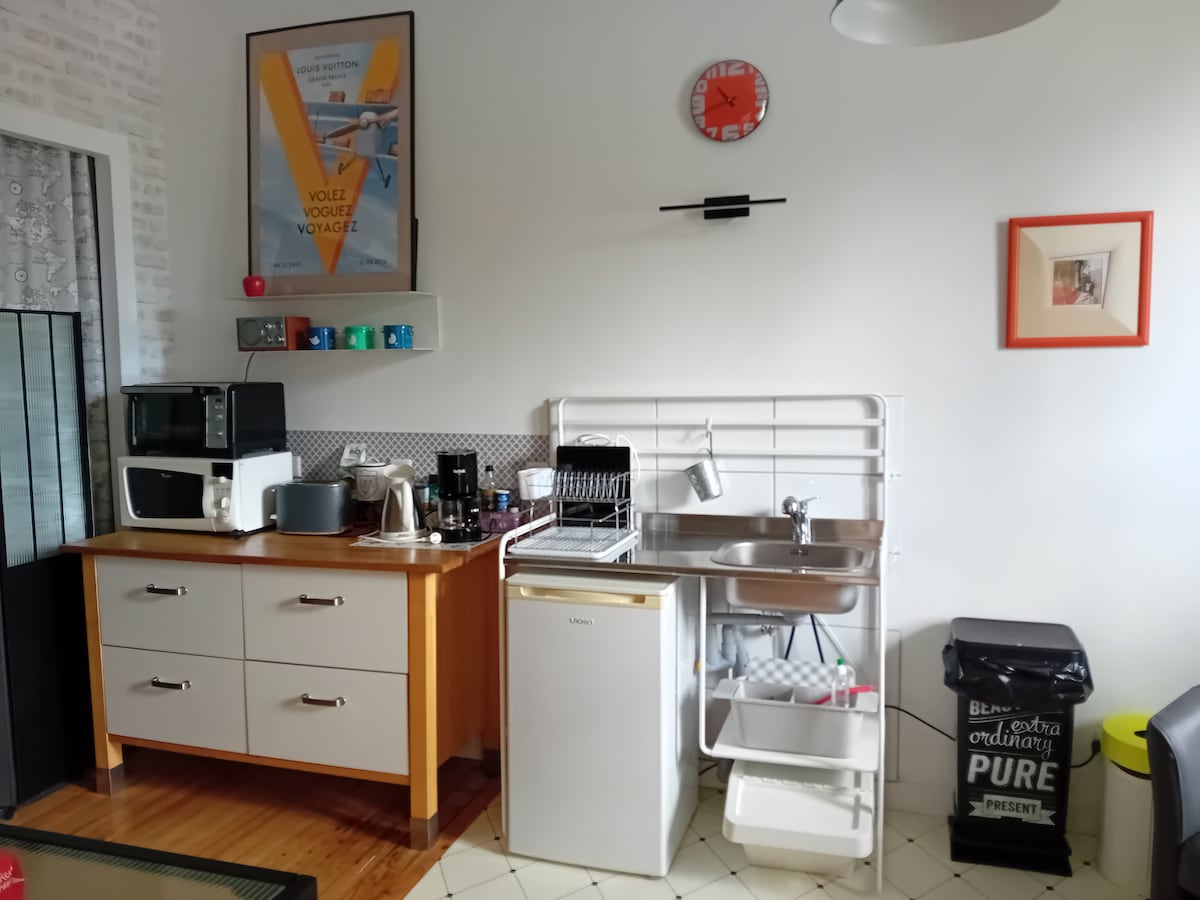 Studio je idealno smešten u centru, u srcu Viil Ansi. Potpuno renoviran: vrlo dobro opremljen, udoban i funkcionalan. U mirnoj rezidenciji na trgu ispred kanala. 5 minuta od železničke stanice i jezera. Glavna soba sa spavaćom sobom i trpezarijom + mala opremljena kuhinja je veoma dobro opremljena i moderna tuš kabina. Na noćnoj strani: novi i vrlo udoban veliki bračni krevet sa TV-om ravnog ekrana preko puta. Pristup internetu.