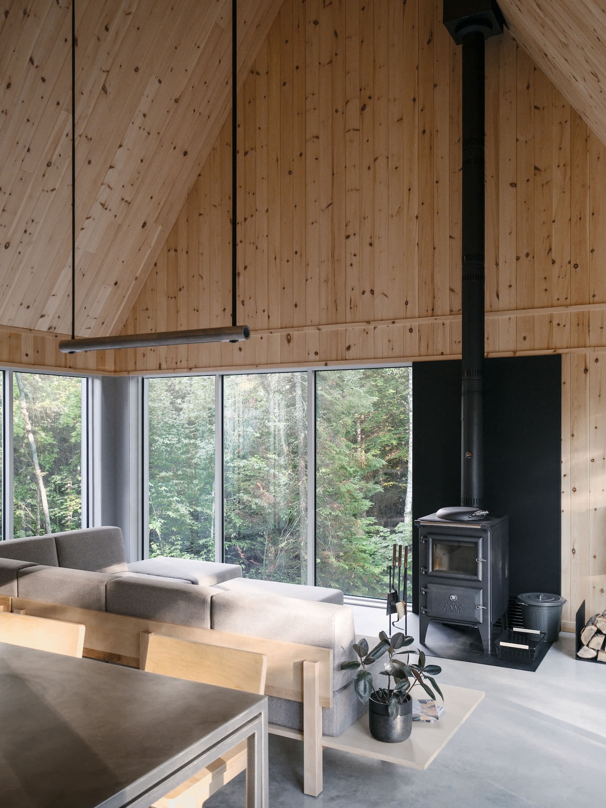 Naša planinska kuća u nordijskoj šumi savršena je za kvalitetno provođenje vremena kao par (ili s djetetom) ili za rad (sa brzim Wi-Fi mrežom). Drvena unutrašnjost je topla i prijatna. Kroz prozore pune visine pruža se zadivljujući pogled na šumovitu dolinu. Kuhinja otvorenog koncepta i dnevna soba vas održavaju u razgovoru dok kuvate. Ako više volite da kuvate napolju, tu je ognjište sa roštiljem i trpezarijskim stolom na otvorenom. Samo 70 minuta vožnje od Montreala. Jezero je udaljeno 25 minuta hoda ako parkirate u blizini.