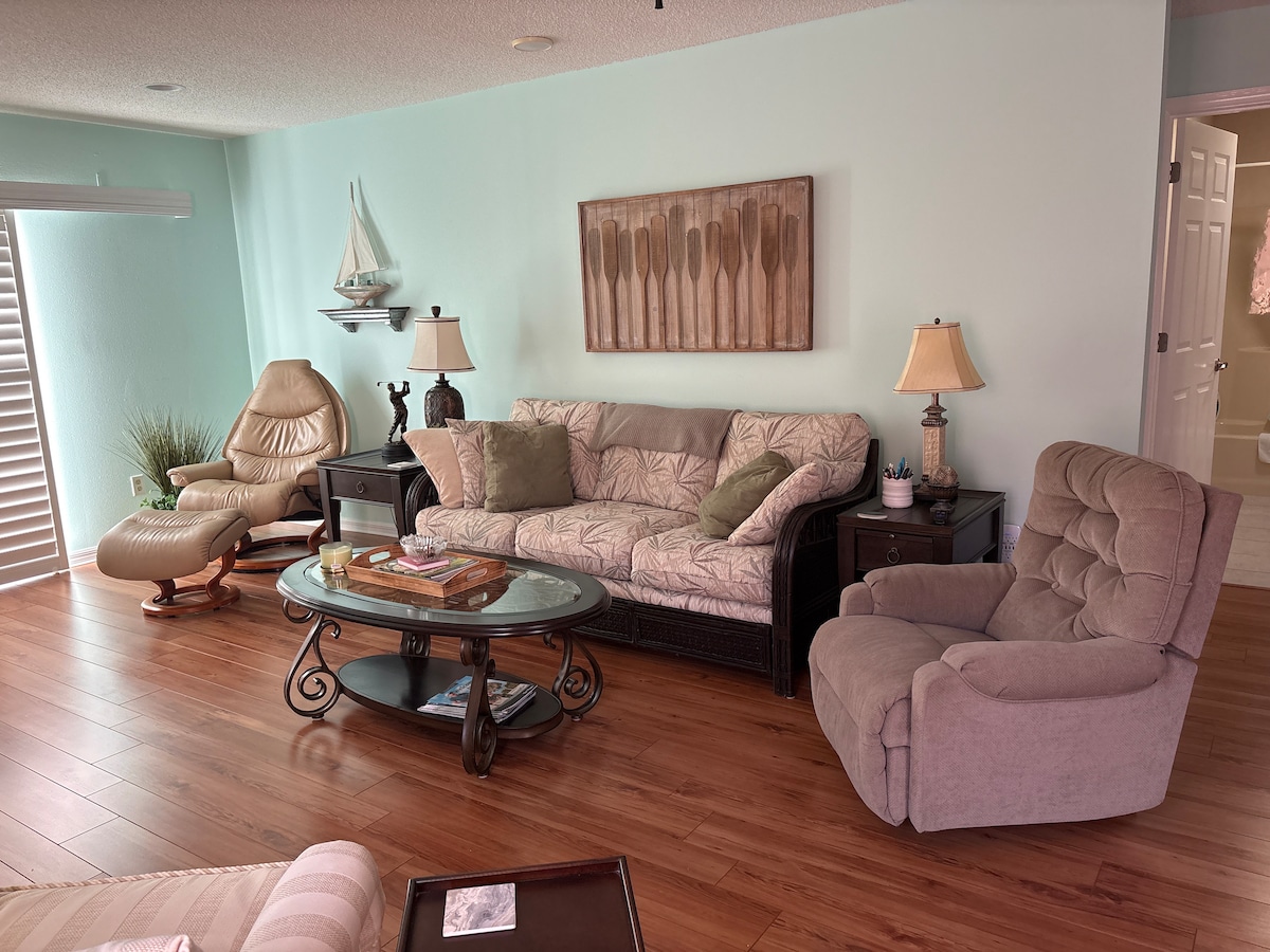 Ažurirana vila sa unutrašnjim dvorištem od 400 kvadratnih metara, samo nekoliko minuta od ulica Sumter Landing i Spanish Springs town squares. Opustite se u ovom udobnom i elegantnom prostoru. Dom je potpuno opremljen sa svime što vam je potrebno daleko od kuće. Da, ima čak i fen i keurig! Vila takođe ima kolica za golf za 4 osobe kako bi parovi mogli da se voze zajedno ili da porodice mogu da odu do bazena. Veliki bračni krevet u glavnoj spavaćoj sobi s TV-om i bračnim krevetom u gostinjskoj sobi Ova centralna lokacija je savršena za turiste