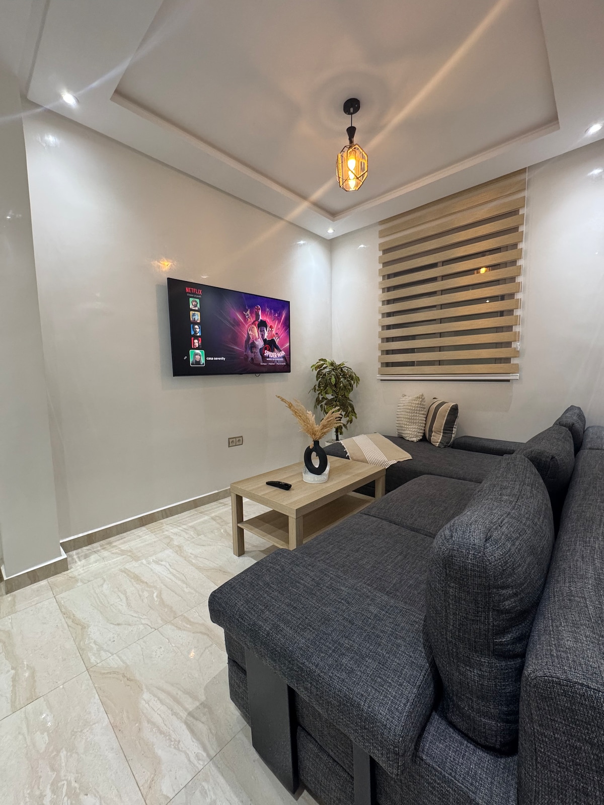 Smješten samo 5 minuta od ulaza na autoput A3, koji vodi direktno do aerodroma Kazablanka za 25 minuta van špica i 35 minuta tokom vršnih perioda, ovaj stan nudi ekskluzivan pristup za odlaske bez stresa. Između Zenita, kalifornijskog tržnog centra i Narshorea, odličan je izbor za poslovne putnike ili porodice. Ima dvije spavaće sobe, dnevni boravak, dnevni boravak i balkon. Uživajte u svim sadržajima sa klima-uređajem, modernom kuhinjom, Wi-Fi mrežom i TV-om od 65 inča.