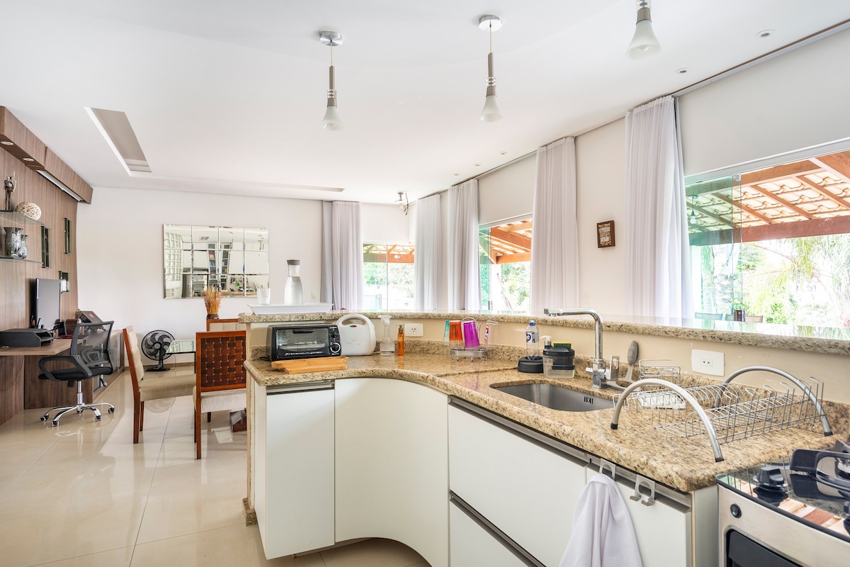 Velika i udobna kuća u ograđenoj zajednici u Lagoa Santi. Ima 400 m² izgrađeno na prostranoj parceli od 1.400 m², sa integrisanim sobama, kompletno opremljenom kuhinjom sa ostrvom i gurmanskim prostorom. Predivan spoljni prostor sa bazenom sa hidromasažnom kadom, pergolom i jezerom sa ribama. Uređenje prostora je zaista impresivno! ✨️ Imamo 4 spavaće sobe (1 master apartman sa hidromasažnom kadom, 1 apartman i 2 polu-apartmana), TV sobu i radni prostor. Cijela i ekskluzivna kuća.