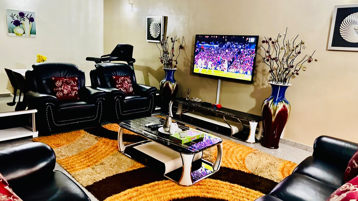 Prostrana dnevna soba i kraljevska soba sa bračnim krevetom, modernim kupatilom i WC-om🚽. Vrlo čist i standardan stan. Royal Pent House vam pruža svu modernu udobnost izvan vaše mašte uz neograničen Wi-Fi velike brzine, 43inchSmart TV u spavaćoj sobi i 55-inčni Smart TV u dnevnoj sobi, YouTube, Netflix, DSTV. Udoban kauč, bojler, čajnik, mikrotalasna pećnica, plin za kuvanje. Alarm za dim, alarm za monoksid, struja non-stop. , CCTV, maksimalna bezbjednost sa osobljem obezbjeđenja non-stop
