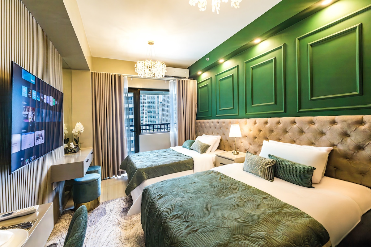 🌟 Savršen za 4 odrasle osobe i više djece, ovaj elegantni 1BR u Uptown Parksuites Tower 1 nudi veliki bračni krevet i veliki kauč na razvlačenje sa mekim jorganima, opuštajući masažer za noge pored prozora, kompletnu kuhinju, mašinu za pranje i sušenje veša i izuzetno brz Wi-Fi od 500 MBps. Uživajte u zadivljujućem pogledu na zalazak sunca i horizont BGC-a, Grand Hajata i Manile 🌃 Nakon napornog dana, opustite se na našem udobnom naslonjaču ili kauču dok uživate u gradskim svjetlima ✨ Samo nekoliko minuta hoda do tržnog centra Uptown Mall, Mitsukoshi i Landers 🥳🤍