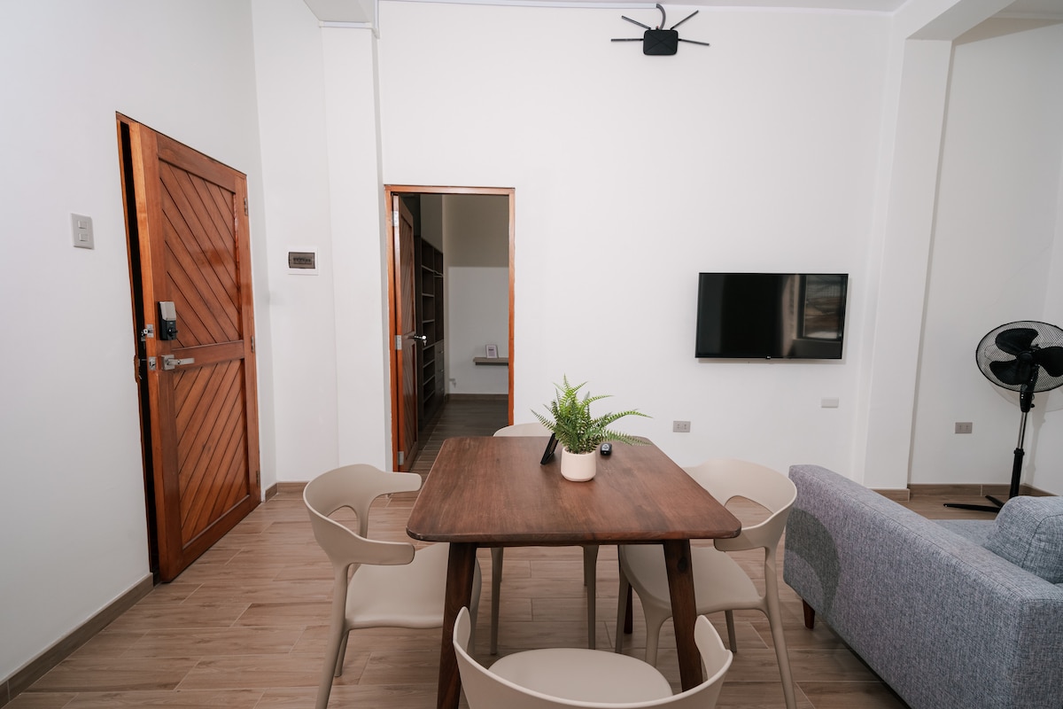 Bello mini departamento tipo Loft independiente , con vista a la ciudad cuenta con una habitación con 1 cama matrimonial en la parte alta ahí mismo está ubicado el aire acondicionado que da a todo el departamento : en la parte baja está la sala, cocina equipada, baño, zona de lavandería, el departamento está ubicada en el centro de la ciudad . Desconéctate de tus preocupaciones en este espacio cómodo y sereno.