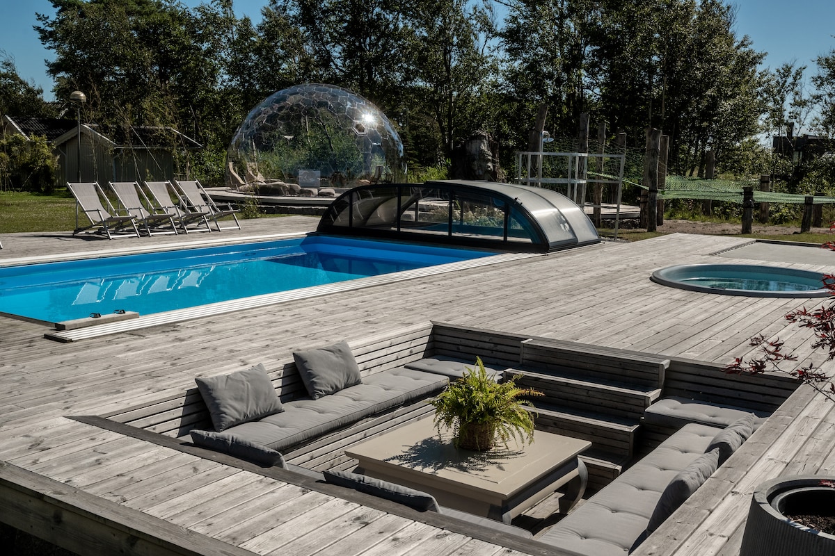 Minijaturna kuća, 30 m2, sa 1 spavaćom sobom, otvorenim salonom/kuhinjom i jednim kupatilom sa tušem. Najviše 4 osobe Pristup grijanom „beskrajnom” bazenu i teretani tako što ćete rezervisati - 1 sat po rezervisanom noćenju je uključeno u cijenu i zajednički prostor u bašti. Spavaća soba ima dva kreveta 80x200cm Sofa se otvara ka krevetu dimenzija 140x200cm. Domaćin živi u glavnoj kući nasuprot minijaturne kuće. U blizini su E6, prirodni rezervati, jezera i plaže.