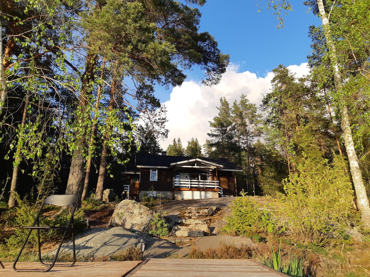 Valoisa, tilava ja tunnelmallinen Päivänsäde mökki aurinkoisella paikalla kallioilla luonnon rauhassa. Aurinkopaneeleista valot, kännykän lataus ja jääkaappi. Kaasuliesi. Juomavesi ja liinavaatteet mukaan. Lemmikki sallittu. 2 venettä. Upea grillikatos, hiiligrilli. Cosy cottage in the sunny place in the middle of the forest by a small lake. Food cooking with gas stove in the kitchen or the charcoal grill. Lighting, mobile phone charge and fridge from the solar panels. 2 boats.