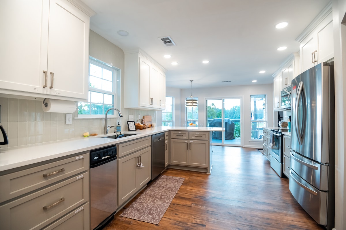 Novi smeštaj sa 5 zvezdica! Uživajte u elegantnom iskustvu u ovom centralno lociranom smještaju s imanjem na obali 278 stopa, nadsvođenim dnevnim boravkom i trpezarijskim prostorom sa kaminom otvorenim prema kuhinji i ekranom na tremu. 4 spavaće sobe, 2 bračna kreveta, 1 bračni krevet i 1 spavaća soba (2 puna i2 XL blizanca) sa svim profesionalnim aparatima, ogromnim ostrvom i 2 frižidera (drugi frižider u vešu). Pametni televizori, besplatan Wi-Fi, zvučni sistem u kući. Plutajući dok, na zahtev, ognjište, kanu i daska za veslanje