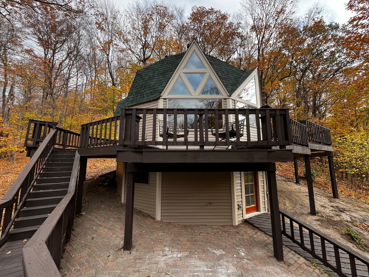 Uživajte u zvucima prirode i pogledu na Glen Lejk dok boravite u ovoj jedinstvenoj Kupolastoj kući. Nalazi se na osami, ali u blizini Glen Arbora, Kristalne rijeke, Palmer Woods MTB staza, Glen Lejk i pješačenja po pješčanim dinama uspavanog medvjeda. Kuća se nalazi na brdu s terasom kako biste uživali u pogledu i vanjskom ognjištu s pogledom na jezero Glen. Ili uživajte u pogledu iznutra uz šporet na drva. U roku od 5 minuta vožnje možete doći do javnog pristupa jezeru Glen ili jezeru Mičigen.