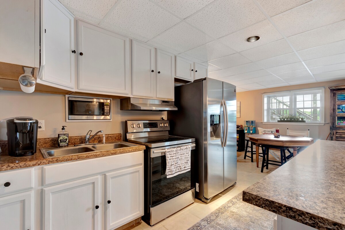 3 spavaće sobe, plus potkrovlje, 3 kupatila! Mnogo svetla sa zidom od prozora u sjajnoj sobi, sa pogledom na terasu sa pogledom na jezero. Veliki završeni podrum sa prozorom sa slikom sa pogledom na terasu nižeg nivoa. Na doku se nalazi terasa za sunčanje na vrhu. Odvojite garažu za dva automobila sa parkingom za najviše četiri automobila. Dom je u potpunosti ograđen/ograđen, savršen za porodice sa malom decom! Ponesite svoj brod! Opustite se u sva četiri kamina! Posmatrajte zalazak sunca uz igru pikada ili kukuruza na terasi!