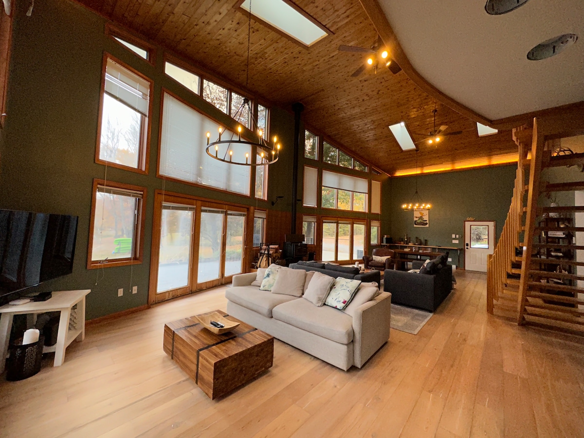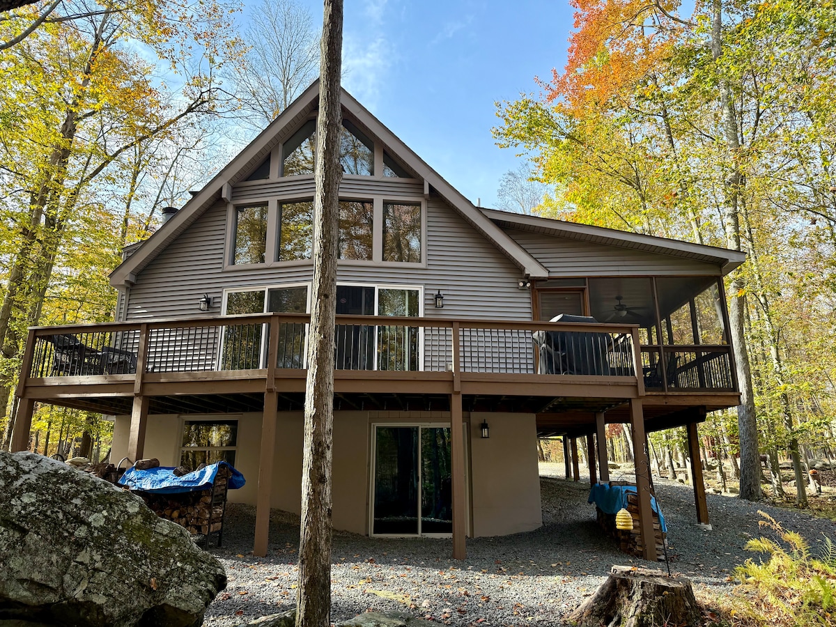 Cherry Ridge Cabin is a very special cabin on 36 acres of your own private forest & trails in the NEPA area of the Poconos Mountains. Plivajte, vozite kajak i opustite se pored našeg ogromnog privatnog jezera od 5 hektara pod nazivom Big Bird Pond, kao što je predstavljeno u Filadelfiji Mag. Jezerce se ne dijeli ni sa kim drugim! Pratite nas na IG (cherryridgecabin). Ova vrlo prostrana brvnara ispunjena svjetlom nudi 4 spavaće sobe i 4 kupatila, dobro opremljenu kuhinju, kamin na drva, kamin, ognjište i još mnogo toga. Ova brvnara je idealna za 9 osoba.