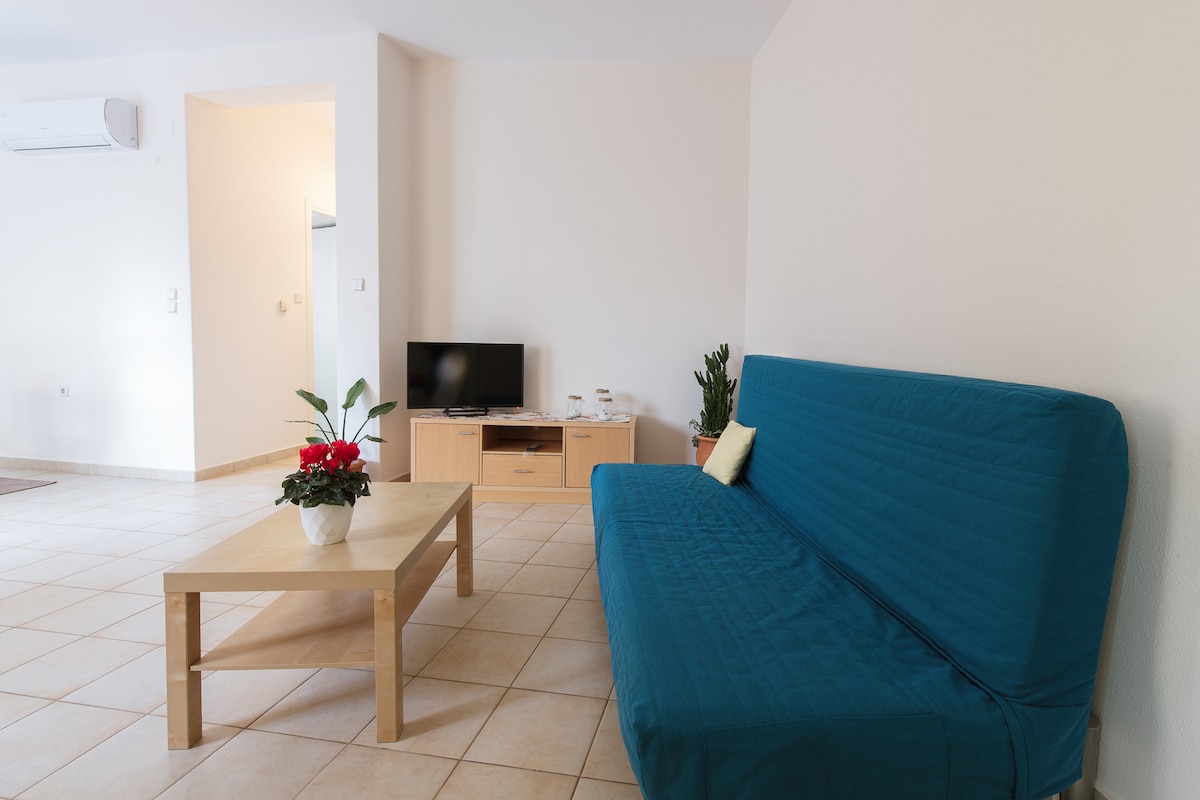 Jednostavan, topao i jednostavan dvosoban apartman sa klima uređajem na poslednjem spratu stambene zgrade u centru grada, sa malim balkonom i tendom na mirnoj strani zgrade. 150 metara od centralnog trga Komotini. Pekara na 20 metara, picerija u istoj zgradi, tradicionalni kafić, kao i razne kafiće i prodavnice bugaca na 50 metara. Ima sve pogodnosti i računar.