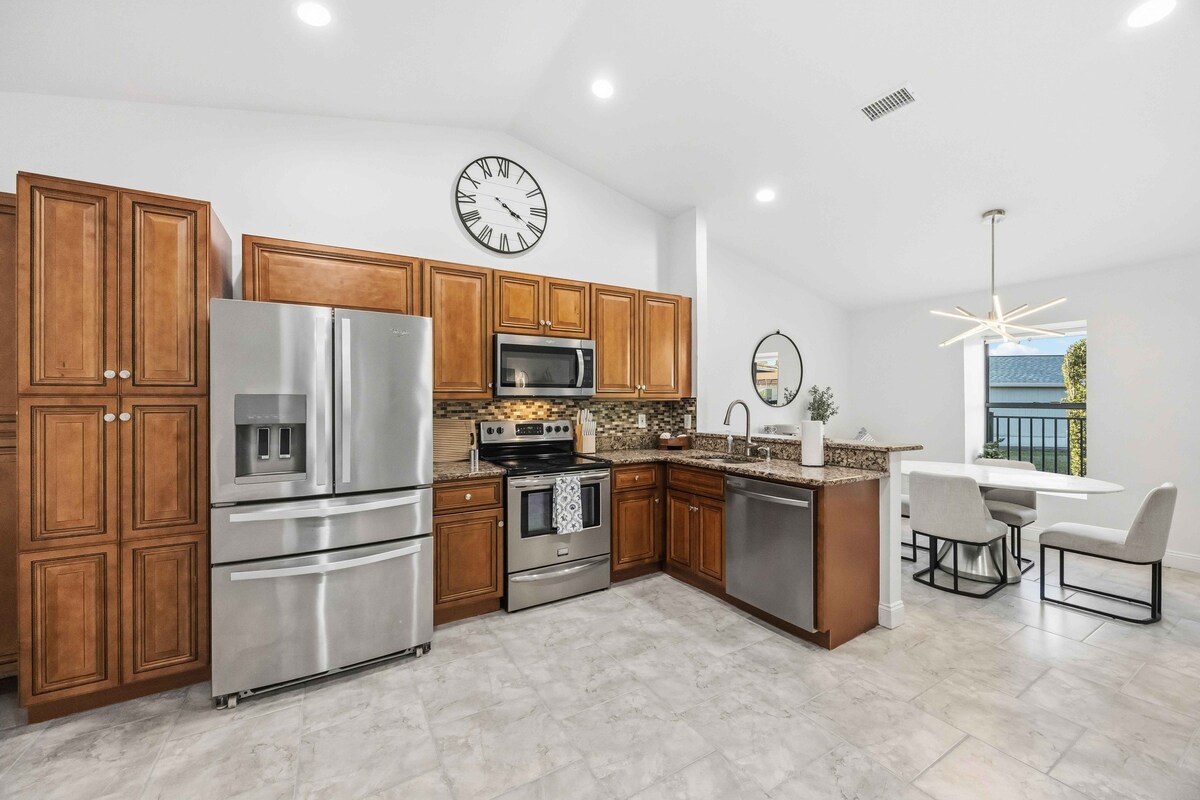 Opustite se sa cijelom porodicom u ovom mirnom smještaju. Suncoast Villa nudi svijetlo, prostrano utočište s otvorenim dnevnim prostorima, potpuno opremljenom kuhinjom i udobnim spavaćim sobama dizajniranim za opuštanje. Uživajte u privatnoj oazi u dvorištu, savršenoj za opuštanje nakon dana na plaži. Idealno smješten u blizini plaža zaliva, restorana, parkova i golfa, ovaj privlačni dom je savršen spoj udobnosti, praktičnosti i sunca Floride. Kućni ljubimci su dozvoljeni (primenjuje se naknada za kućne ljubimce) i nalazi se na parceli od preko pola hektara.