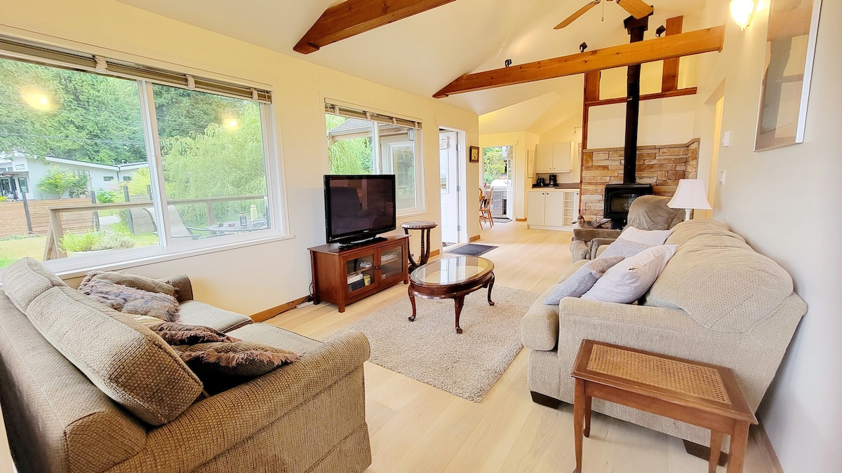 Prava obala – na samoj plaži! Ovaj dom ispred okeana okrenut prema zapadu u potpunosti je renoviran i zadržava dio svog prvobitnog šarma iz 1939. godine. Iz ove svijetle, udobne seoske kuće s nadsvođenim plafonima vidjećete i čuti okean, posmatrati orlove kako lebde iznad glave i vidjeti foke, vidre i čaplje. Prošetajte i popijte kafu u jednoj od prodavnica u Dejvis Beju, 2 minute hoda. Uživajte u zadivljujućim zalascima sunca noću. Nalazimo se na autoputu Sunshine Coast, sa jednostavnim pristupom sadržajima. Sechelt je udaljen samo 4 minuta vožnje.