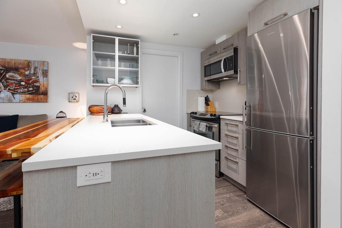 Dobro došli u naš novi kondominijum u Vankuveru. Savršena lokacija u blizini BC Place, Rogers Arena, Gastown, Chinatown i Brewery District. Uživajte u vrhunskim sadržajima zgrade, uključujući dvije prostorije za fitnes, sobu za igre, roštilj na otvorenom i terasu sa zadivljujućim pogledom na planine i okean. Jedinica ima mašinu za pranje i sušenje veša, potpuno opremljenu kuhinju sa svim posuđem i stanicu za kafu. U blizini se nalaze namirnice, javni prevoz i vrhunski restorani!