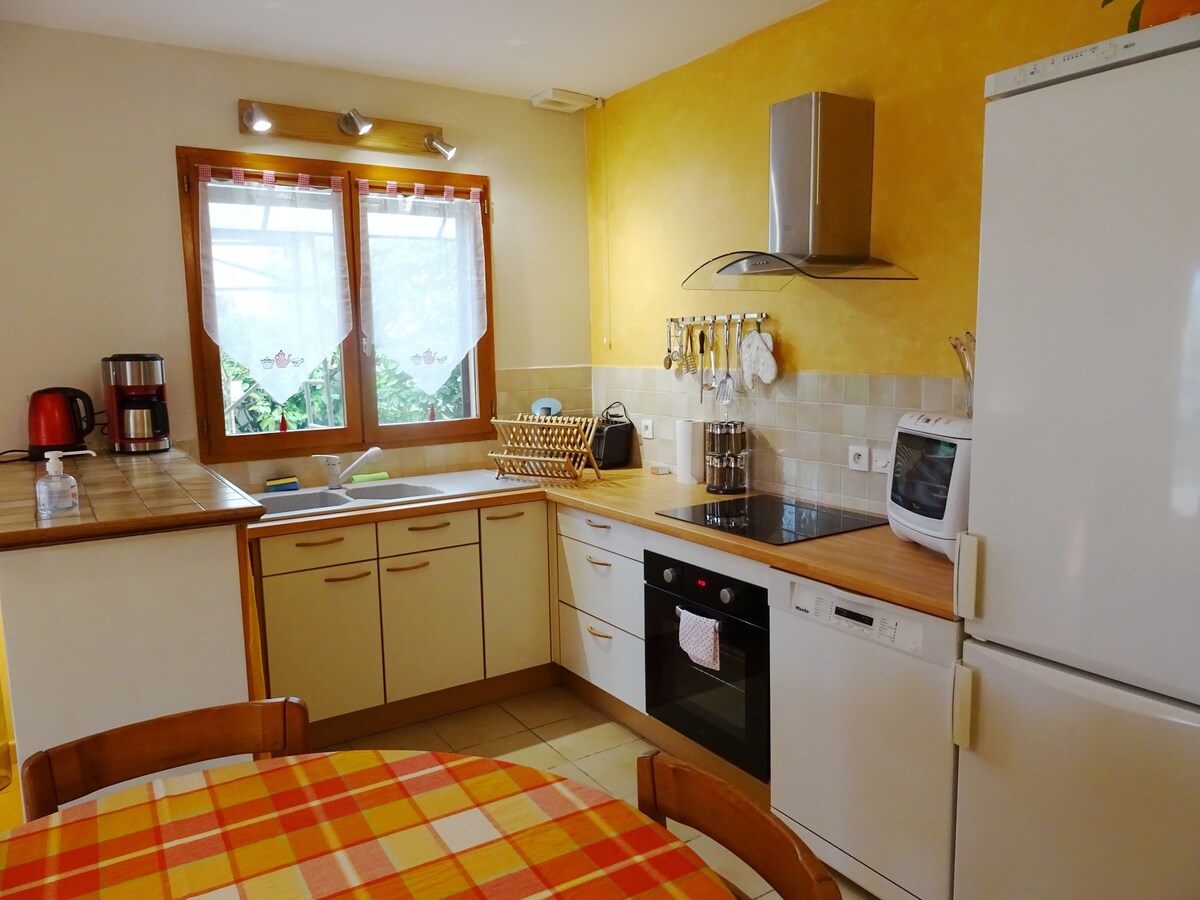 Dobro došli u ovaj prelijepi stan od 70 m², topao, idealan za opuštajući ili profesionalni boravak. u prizemlju, veliki dnevni boravak s pogledom na terasu, uključuje potpuno opremljenu kuhinju, trpezariju, dnevni boravak sa kaučem na razvlačenje. Na spratu se nalazi odmorište koje vodi do velike spavaće sobe sa krevetom dimenzija 160 x 200 i kupatila. Nalazite se na 3 minuta od autoputa i šoping područja, dok uživate u miru sela. Obezbijeđen parking u dvorištu (automobili, motocikli, bicikli)