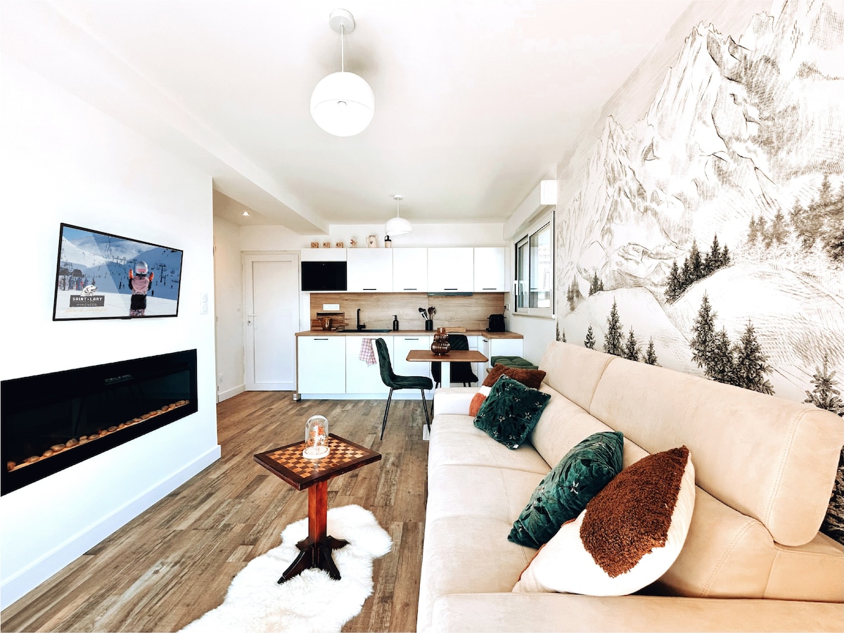 Dobro došli u našu neodoljivu drvenu planinsku kuću koja se nalazi u Udobnosti Haj Pirineja, sa skandinavskim šarmom i vintage, neobičnom arhitekturom trouglastog oblika, tipična za severnoameričke planinske kuće iz 60-ih godina, očaraće vas. Takođe ćete ceniti okolni mir i izvanredan pogled na planine i dolinu Argelčs Gazost.