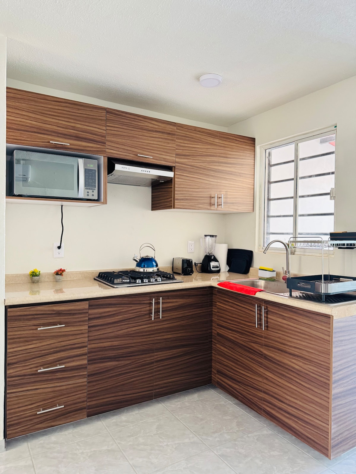 Cómodo departamento para una estadía agradable. Cuenta con buena iluminación y ventilación. Ubicado frente a unidad deportiva. Lugares cercanos; gimnasio, tiendas de abarrotes, centro de salud, farmacia, lavandería, puestos de comida y paraderos de camión. Entradas y salidas rápidas hacia las distintas carreteras. El espacio está diseñado para quedarse 3 personas cómodamente. La hora de ingreso (check in) es a partir de las 3:00 pm y la hora de salida (check out) es más tardar a las 12:00 pm.