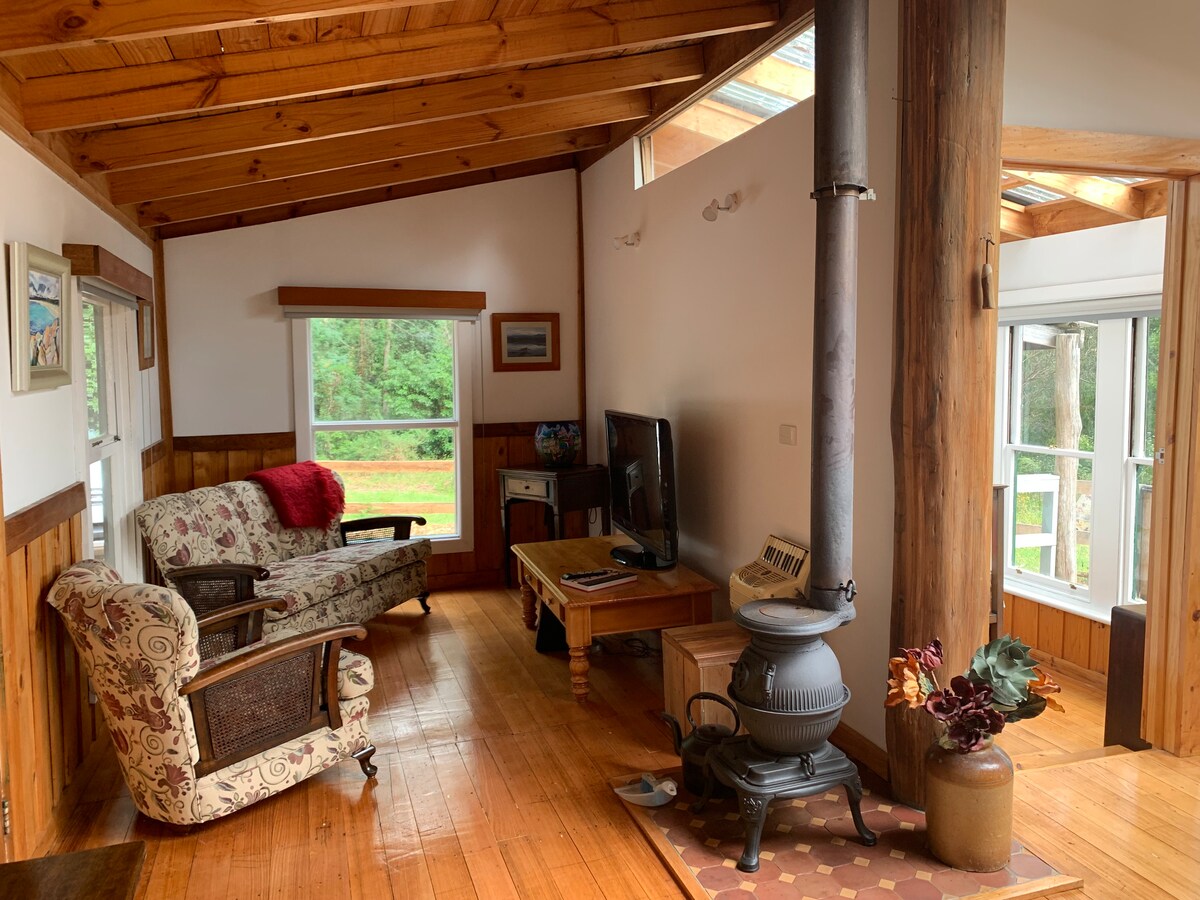 Odmorite se i opustite u ovom mirnom smeštaju na farmi van civilizacije, uživajte u kupki u ognjištu na otvorenom, berite sezonske poljoprivredne proizvode, skupljajte jaja i uživajte u spokoju. Sjedite uz čašu vina pored vatre 🔥slušajte žabe u brani ili dolje u blizini potoka. Često nas posećuju kookabure, koale, vombati i još mnogo toga. Ako je vaša poseta tokom oblačnih ili hladnih perioda, molimo vas da pročitate uputstva za kamin i priručnik za održavanje kuće pre nego što zapalite vatru kako biste izbegli da se zadimite :)