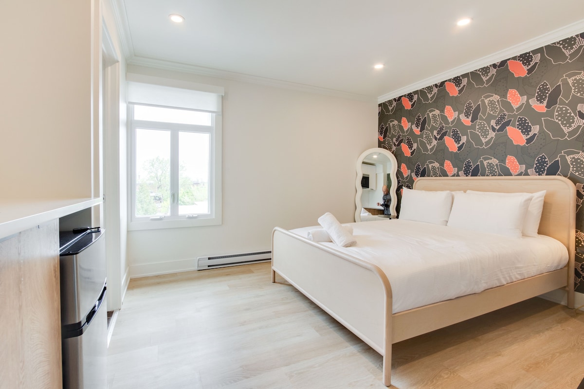 This elegant hotel room blends style and comfort, featuring a plush king bed with premium linens. Located in one of Montreal’s most vibrant neighborhoods, you’re steps from cafés, bars, and cultural gems. Guests also enjoy access to a welcoming lobby lounge and a spacious basement with cozy seating, a pool table, and big-screen TV—perfect for work or relaxation.