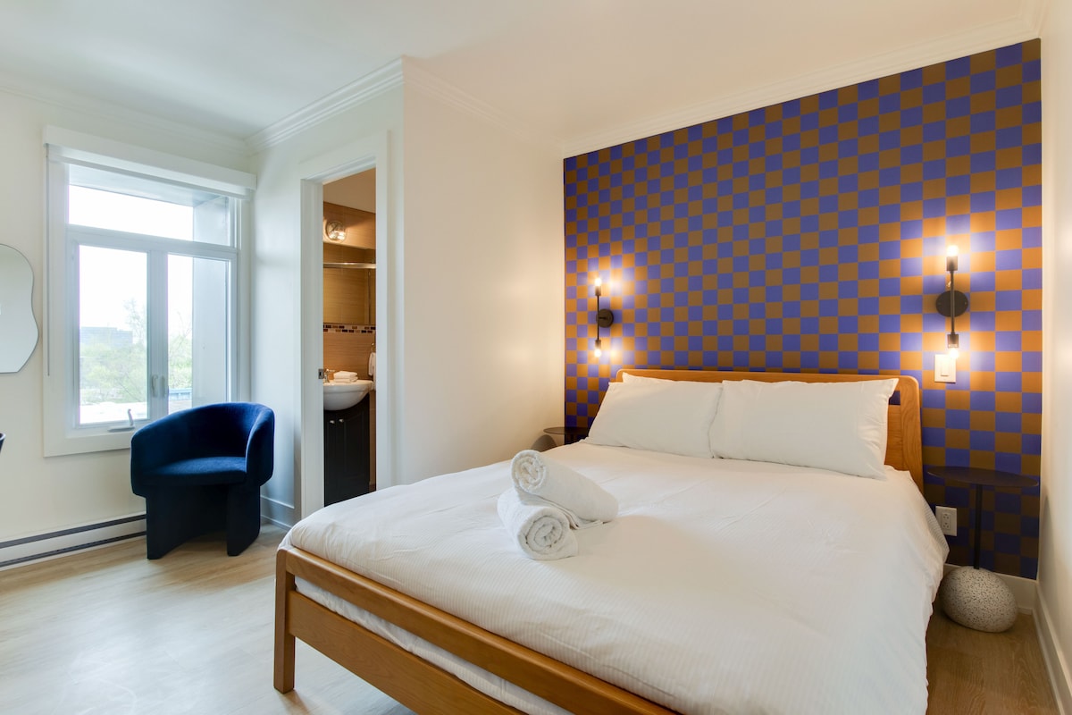 This elegant hotel room blends style and comfort, featuring a plush queen bed with premium linens. Located in one of Montreal’s most vibrant neighborhoods, you’re steps from cafés, bars, and cultural gems. Guests also enjoy access to a welcoming lobby lounge and a spacious basement with cozy seating, a pool table, and big-screen TV—perfect for work or relaxation.