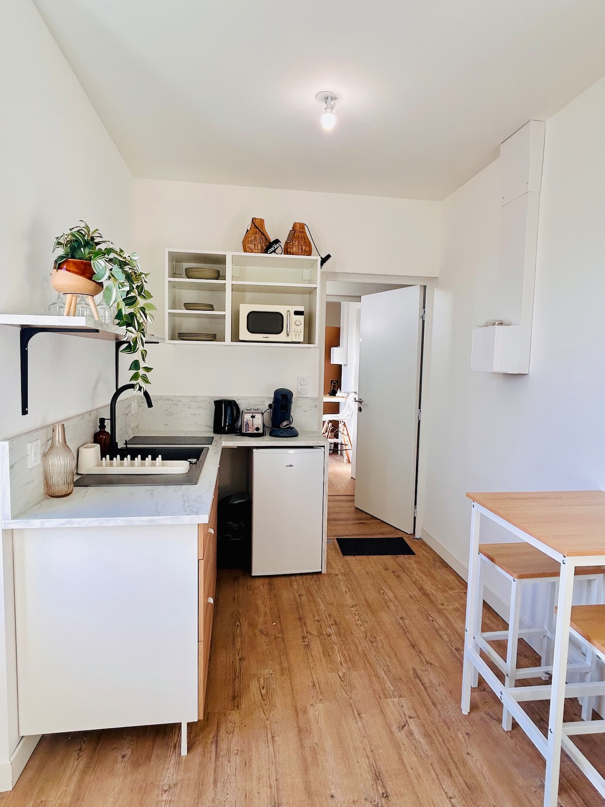 Prostran i sunčan nezavisni studio apartman. Imaćete: – Bračni krevet (širok 180–220 cm) - Mikrotalasna rerna - Bojler za vodu - Nespresso aparat za kafu - Veliki frižider - Sudoper - Posuđe i pribor za jelo - Smart TV -WIFI Nema kuhinje Kupatilo Odvojeni toaleti. Posteljina (posteljina i peškiri su obezbijeđeni) Lako je kretati se okolo tako što ćete uzeti C4 100 m dalje (stanica Champ Fleuri prema Nantesu). 15 minuta od aerodroma. Radujemo se što ćemo vas ugostiti!