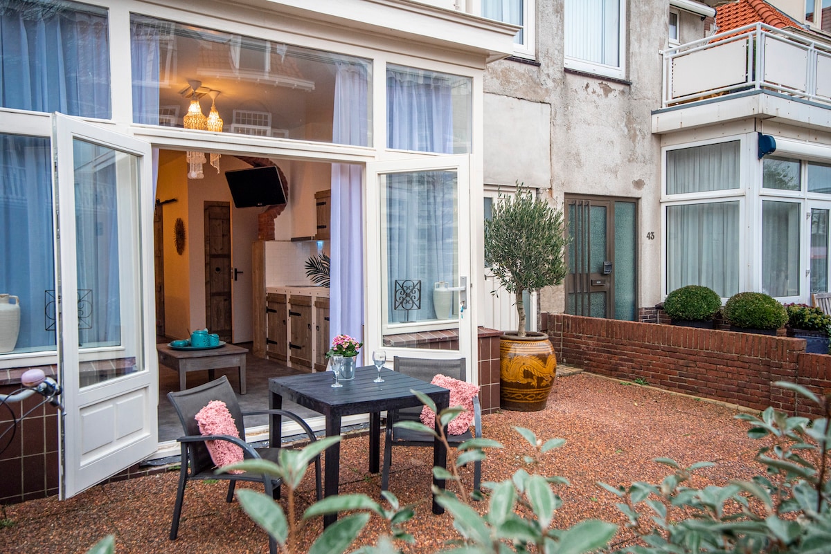 Our sunny garden chalet is freely situated in our 400 spuare metre-large garden behind the house. The chalet has sliding doors to the garden, a pull out sofa bed (double), an open kitchen, underfloor heating and a wood stove. Enjoy the peace on your own sunny terrace among the flowers and plants! Located in the heart of the flower bulb area near the coast, within 7 minutes walking distance to the train station.