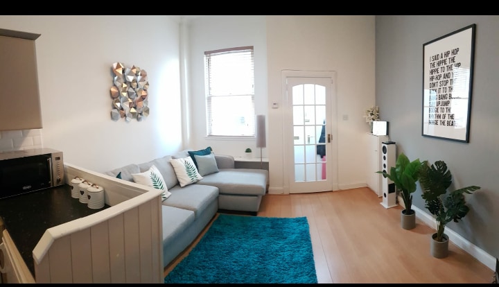 Prostrani trokrevetni stan na gornjem spratu u centru Njutauna