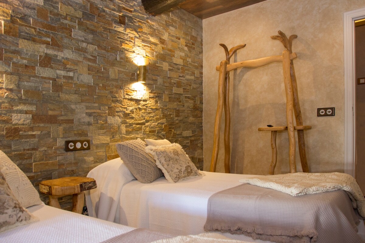 Habitación de hotel boutique con encanto, de dos camas y baño privado externo, a un metro de la habitación y para uso exclusivo de ella. Se encuentra en pleno centro de O Cebreiro, cuidada hasta el más mínimo detalle.