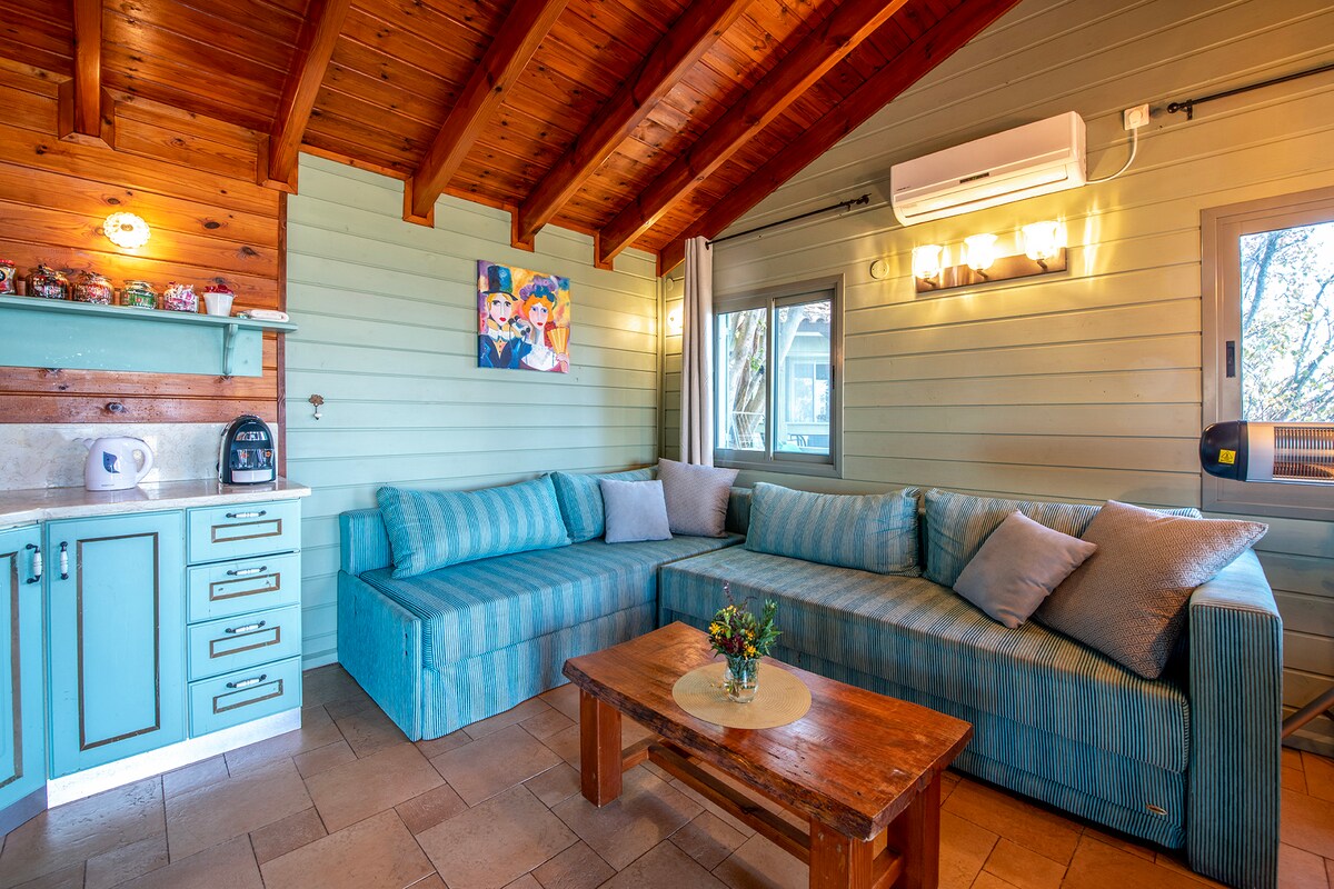 Our Deluxe chalet is a studio chalet – The entire chalet is one open space (except for the bathroom of course…) The chalet has a Living space with T.V, a small basic kitchenette, indoor Jacuzzi and a bathroom with a shower and toilets. From the chalet's balcony you can look over a spectacular view of the Sea of Galilee. The Chalet has 1 double bed and 3 sofa beds and fits best for 2 adults and 2 children. We don’t recommend it for 2 couples or 5 adults. **This chalet is 1 of 6 in the property
