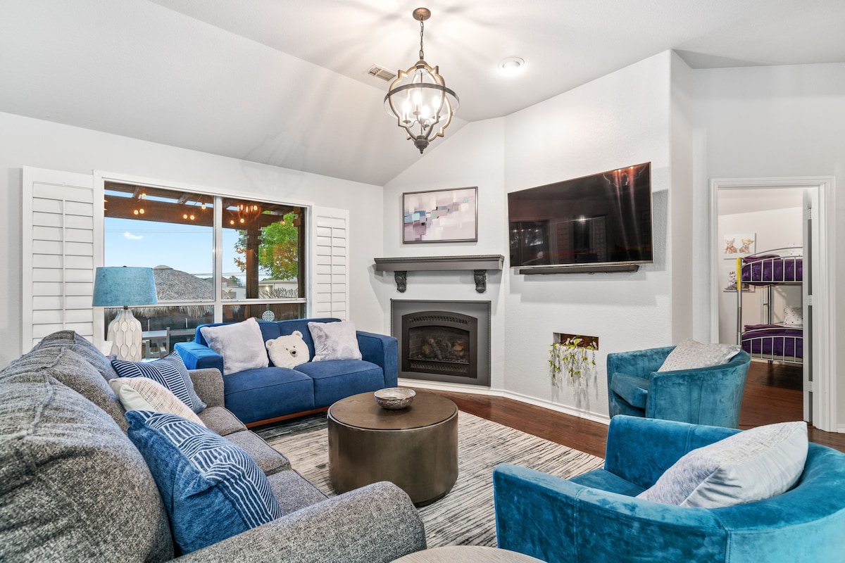 Otkrijte svoj šareni odmor u Luisvilu (Teksas)! Ovaj smještaj sa 4 spavaće sobe i 2 kupatila ima dva dnevna boravka, sobu za igre i prostor za rad. Napolju uživajte u hidromasažnoj kadi, mini golfu sa 6 rupa, bioskopu na otvorenom sa sjedećom garniturom za sjedenje i igralištu za djecu. Savršeno za porodice ili grupe koje žele da se opuste i zabave iznutra i napolju!