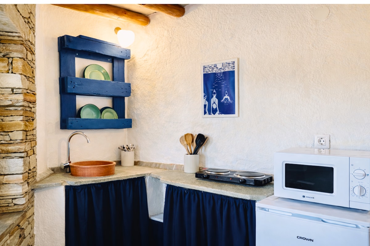 Kameni apartman na samo 10 metara od plaže. Veoma veliki prozori za uživanje u pogledu na more, spoljna pergola sa prostorom za sedenje i stolom. Potpuno opremljena kuhinja i udobno kupatilo/tuš kabina. Penjući se drvenim stepenicama dolazite do spavaće sobe iz koje možete bolje uživati u pogledu na more. Intenzivno prisustvo drveta u kombinaciji sa ugrađenim krevetom i kaučem podseća na velelepne kuće na Kikladi.