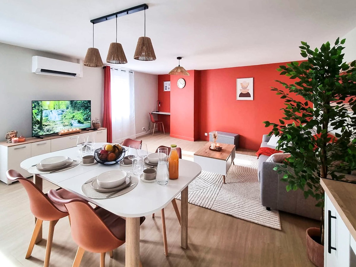 Vrlo lijep stan od 60 m2 sa starinskim dekorom koji će vas odvesti na putovanje! U srcu gradske četvrti, u neposrednoj blizini svih prodavnica, možete prošetati i vrtovima događaja i obalama Beča. Prelijepa željeznička stanica (najljepša na svijetu!) udaljena je 3 minute vožnje i 8 minuta hoda. Aerodrom je udaljen najviše 20 minuta vožnje automobilom. Okolina je pješačka, ali ćete u blizini pronaći besplatna parking mjesta. Odlično mjesto za otkrivanje Limoža😃
