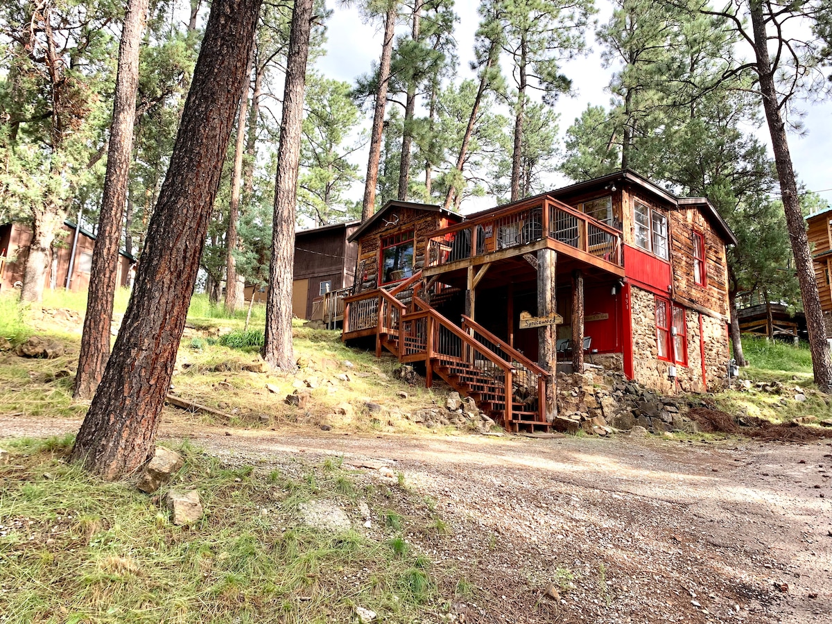 Ova udobna brvnara mirno se nalazi među visokim borovima i savršena je za 4 gosta. Sa jednom spavaćom sobom, jednim kupatilom, dnevnim boravkom, trpezarijom, kompletnom kuhinjom, radnim stolom, novom hidromasažnom kadom i terasom; idealan je za one koji žele da se opuste i uživaju u onome što nudi Ruidoso. Nalazi se u mirnom kvartu koji je kratka 10-minutna šetnja niz brdo do Midtauna, seoskog centra za kupovinu i restorane. Brvnara je udaljena 37 minuta vožnje do Ski Apača, 10 minuta vožnje do kazina.
