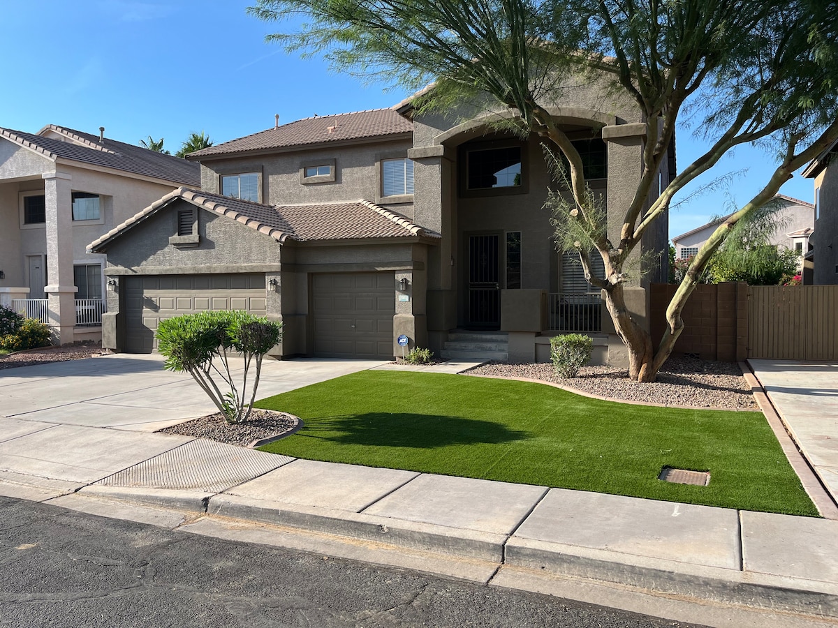 Gorgeous Southwestern style home is located in Glendale AZ within 1 mile distance to Cardinals Stadium and West Gate Event Center. Near Outlet mall and restaurants! Catch a game or a concert in town. Waterpark close by coming soon! This home sleeps 8 guests with 4 bedrooms, 2 bath. Community pool & basketball court is a 2 minute drive or 7 minute walk in the neighborhood for use. All smart TVS ready for streaming. Roku channel cable streaming provided. Comfortable beds & high quality amenities!