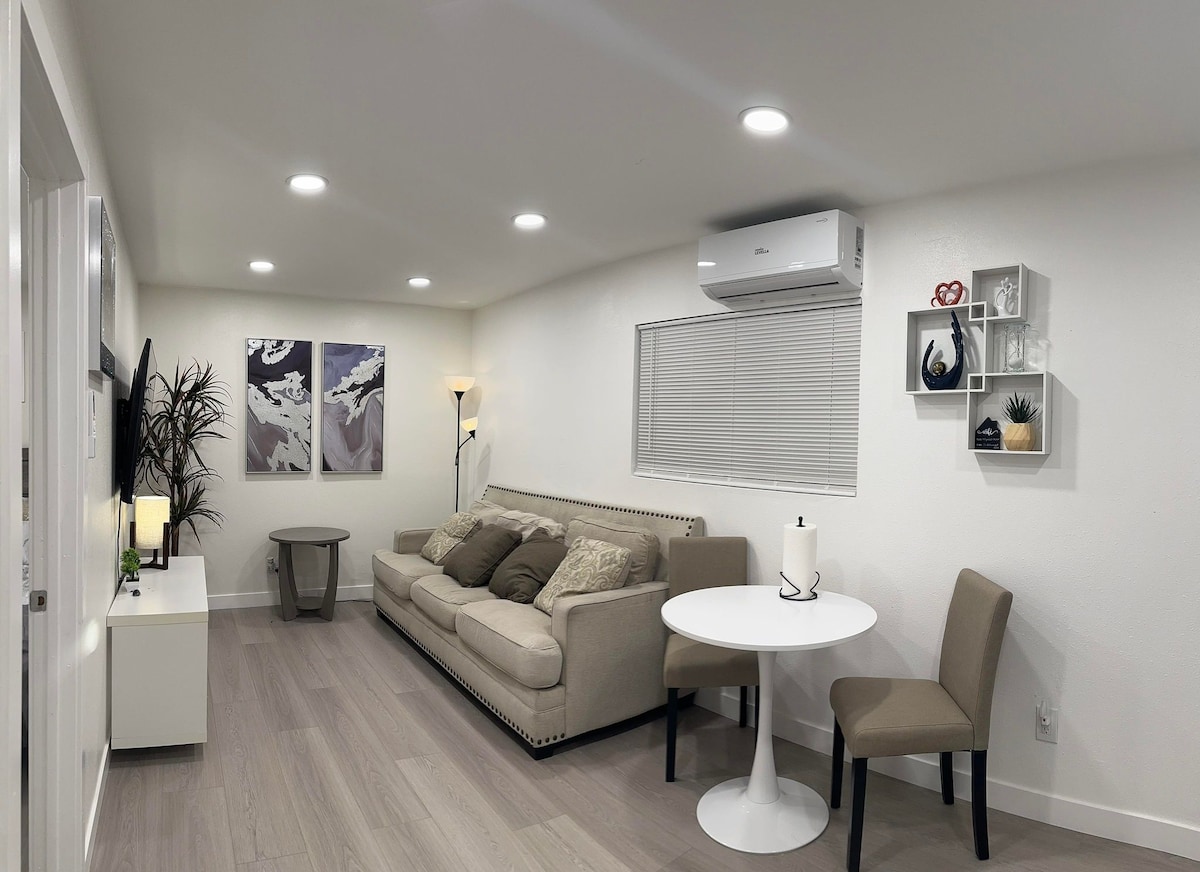 1 krevet, 1 kupatilo, kuhinja i dnevna soba. 1 ograđeno parking mjesto. Iz bezbjednosnih razloga, adresa u Santa Ani je u neposrednoj blizini. Tačna adresa u Garden Grouvu (udaljenom 2,0 milje) biće poslata nakon potvrde rezervacije. Punjač za Tesla nivo 2 dostupan je po cijeni od 25 USD po danu po automobilu. Naknada za trećeg gosta je 35 USD po noćenju (dostupan je kauč na razvlačenje) Dostupna je samoposlužna sauna po cijeni od 30 $ za 2 sata. Ako vam zatreba, slobodno nam se obratite.