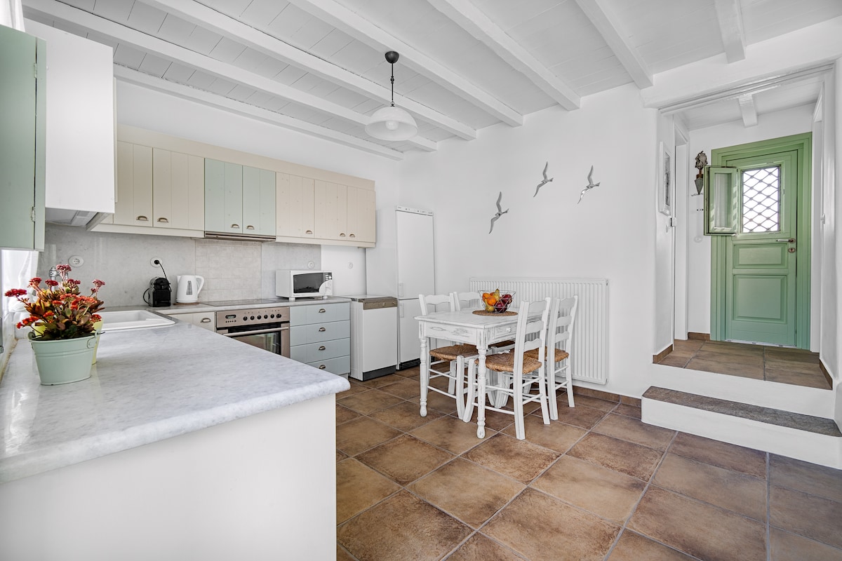 Izgrađen na obronku „En Lefko“ nudi mir i tišinu zajedno sa jedinstvenim pogledom na veličanstvenu Koru. Kuća se nalazi u glavnom gradu ostrva, Livadi i potrebno je samo nekoliko minuta hoda , da biste došli do centra, gde možete da pronađete sve što vam je potrebno. Mala, ali potpuno opremljena, ponudiće vam nekoliko dana za opuštanje i opuštanje!
